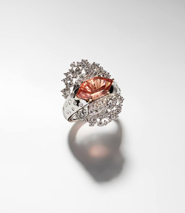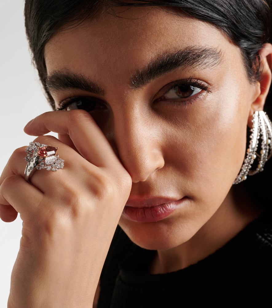 This 18kt white gold ring with tourmaline and diamonds by Ananya is a majestic piece that embodies the essence of pure luxury. The ring's elegant design is expertly crafted from 18kt white gold, and it is beautifully adorned with a magnificent tourmaline (3.05ct) and a brilliant collection of natural diamonds (1.18ctw). The piece feels both powerful and refined, a true statement of uncompromising quality and a celebration of life's most beautiful moments. This ring is an accessory that symbolizes enduring elegance and a confident approach to style.
