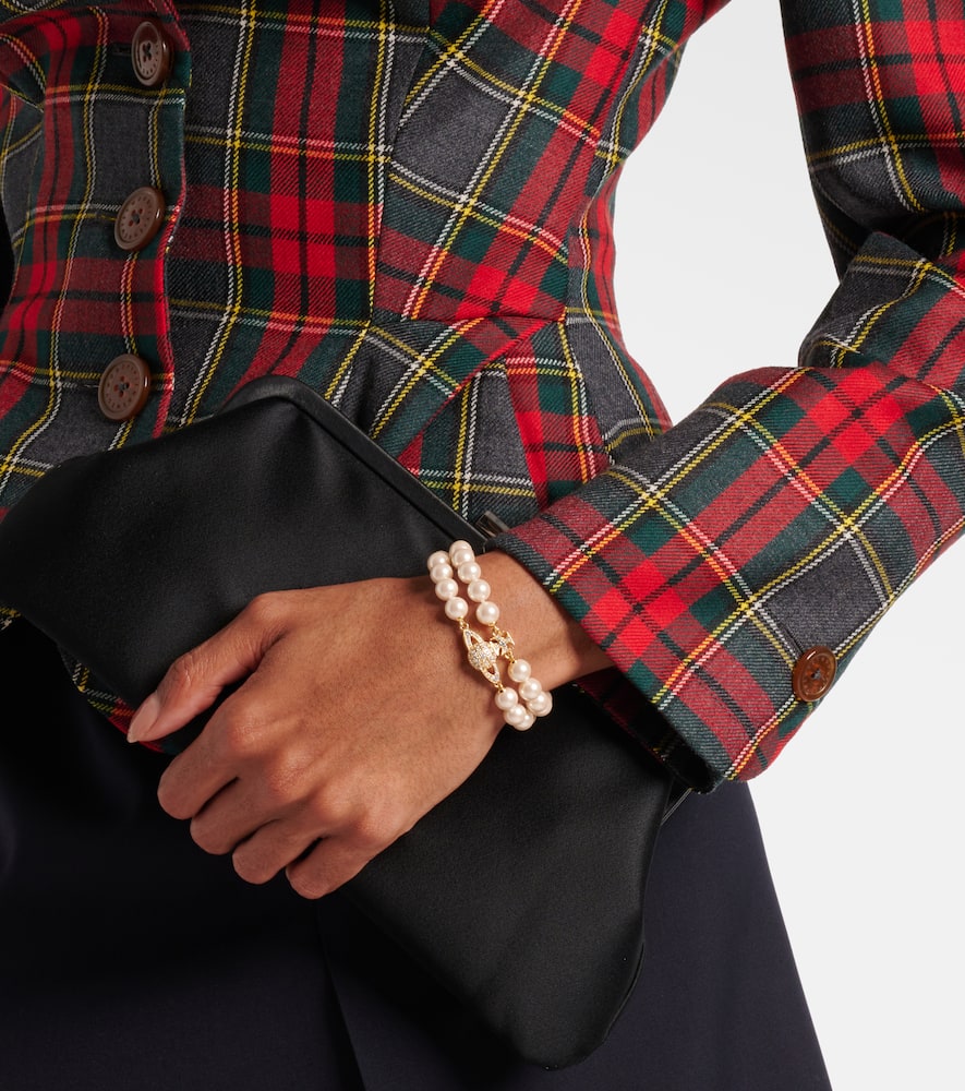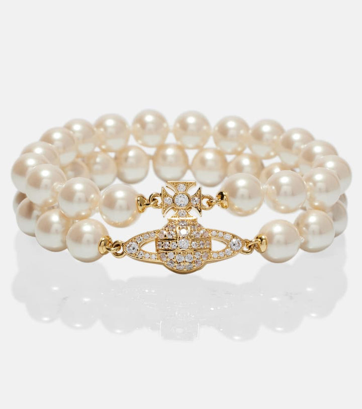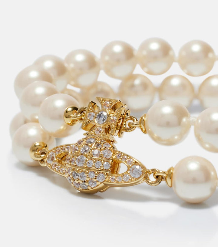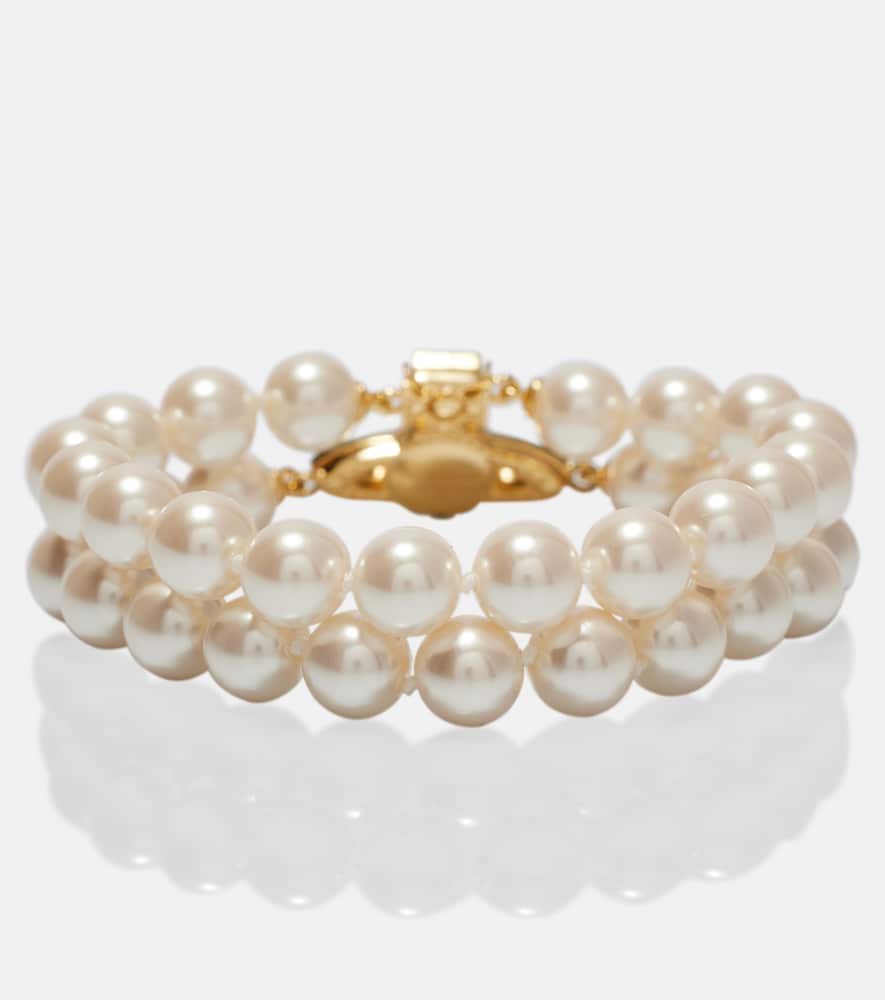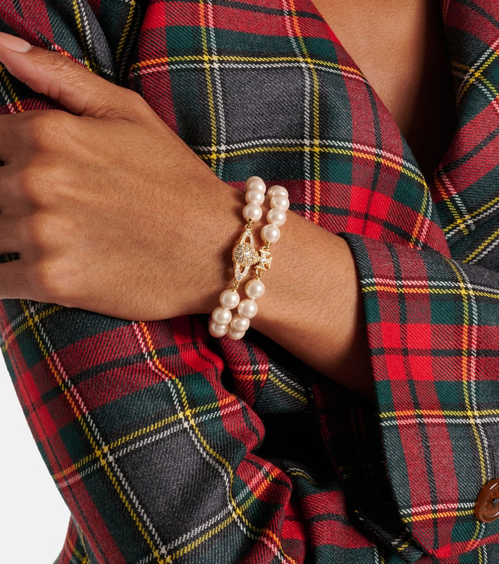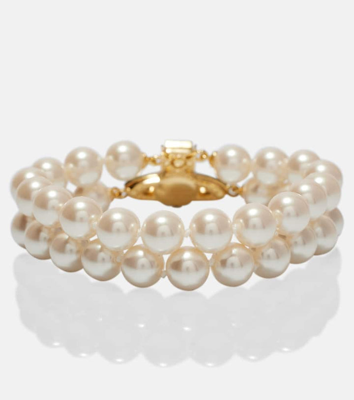 This Graziella embellished faux pearl bracelet by Vivienne Westwood is a whimsical yet glamorous piece that captures the essence of the brand's rebellious aesthetic. The bracelet features a delicate chain expertly crafted from brass, which holds a beautiful array of faux pearls. The piece feels both classic and punk, a true statement of refined style and a celebration of uncompromising quality. This bracelet is a versatile accessory that can be worn for both everyday moments and special occasions, symbolizing a confident approach to style.