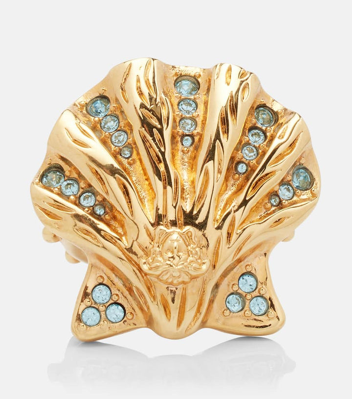 This La Medusa embellished ring by Versace is a bold and iconic accessory that embodies the brand's signature glamour. The sleek design, featuring the unmistakable Medusa head, is finished with a stunning brass base and adorned with shimmering crystals. This ring is a perfect statement piece for the modern woman who appreciates a blend of classic brand recognition and contemporary sparkle. It is the ideal finishing touch to elevate any ensemble, from a simple daytime look to a sophisticated evening outfit.
