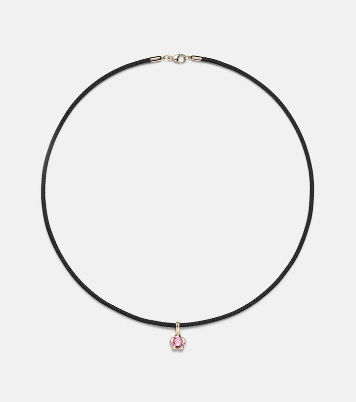 This necklace is made in China from 14kt yellow gold. It features a natural, round-cut tourmaline stone with a total carat weight of 0.7ct. It has a length of 41.5cm (16.5") when open, a width of 2mm (0.1"), a pendant length of 14mm (0.55"), and a pendant width of 8mm (0.3").