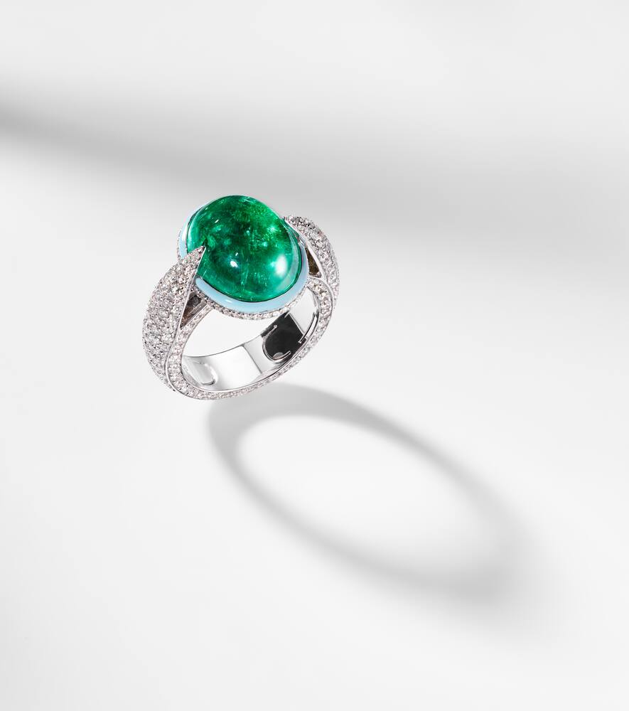 This 18kt white gold ring with emeralds and diamonds by Kamyen is a magnificent and opulent piece that captures the essence of sophisticated luxury. The ring's bold, sculptural form is beautifully complemented by a continuous pavé of natural diamonds and a stunning central oval-cut emerald. The piece feels both powerful and elegant, a true statement of refined taste and a celebration of uncompromising quality. This ring symbolizes royalty, eternal beauty, and the beautiful artistry of nature's most precious gems.