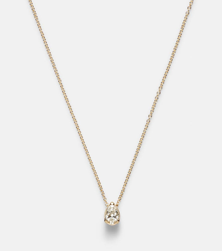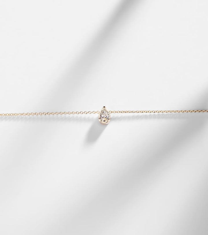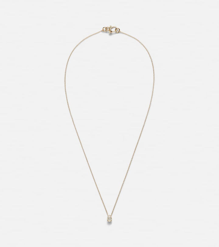 This necklace is made in Italy from 18kt yellow gold. It is set with one pear-shaped natural diamond in a prong setting with a VVS clarity and F-G color grade, totaling 0.3ctw. It has a lobster-clasp fastening, a length of 44cm (17.5"), a width of 1mm (0.05"), and a pendant length of 6mm (0.25") and width of 4mm (0.15").