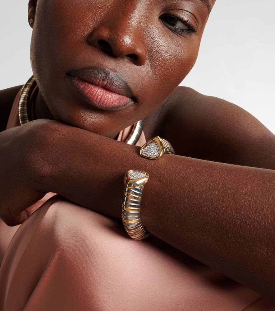 This Trisola 18kt gold bracelet with diamonds by Marina B is a bold and luxurious piece that captures the essence of modern elegance. The bracelet's sculptural, open form is expertly crafted from 18kt yellow gold and is adorned with a brilliant pavé of natural diamonds. This piece feels both artistic and personal, a true statement of refined taste and a celebration of uncompromising quality. It is a versatile accessory that can be worn alone or stacked with other bracelets, symbolizing a confident and artistic approach to style.