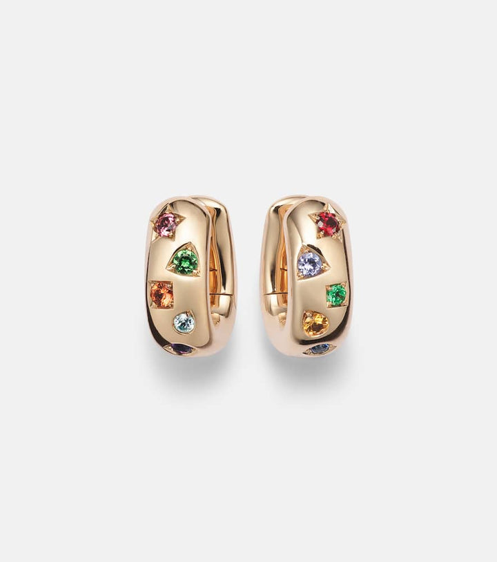 These earrings are a new arrival, made in Italy from 18kt rose gold. They are set with amethysts (0.1ctw), tsavorites (0.2ctw), sapphires (0.1ctw), spinel (0.1ctw), tourmaline (0.1ctw), tanzanites (0.1ctw), and zirconites (0.1ctw). They have a length of 20mm (0.8"), a max. width of 8mm (0.3"), and an inner diameter of 9mm (0.35").