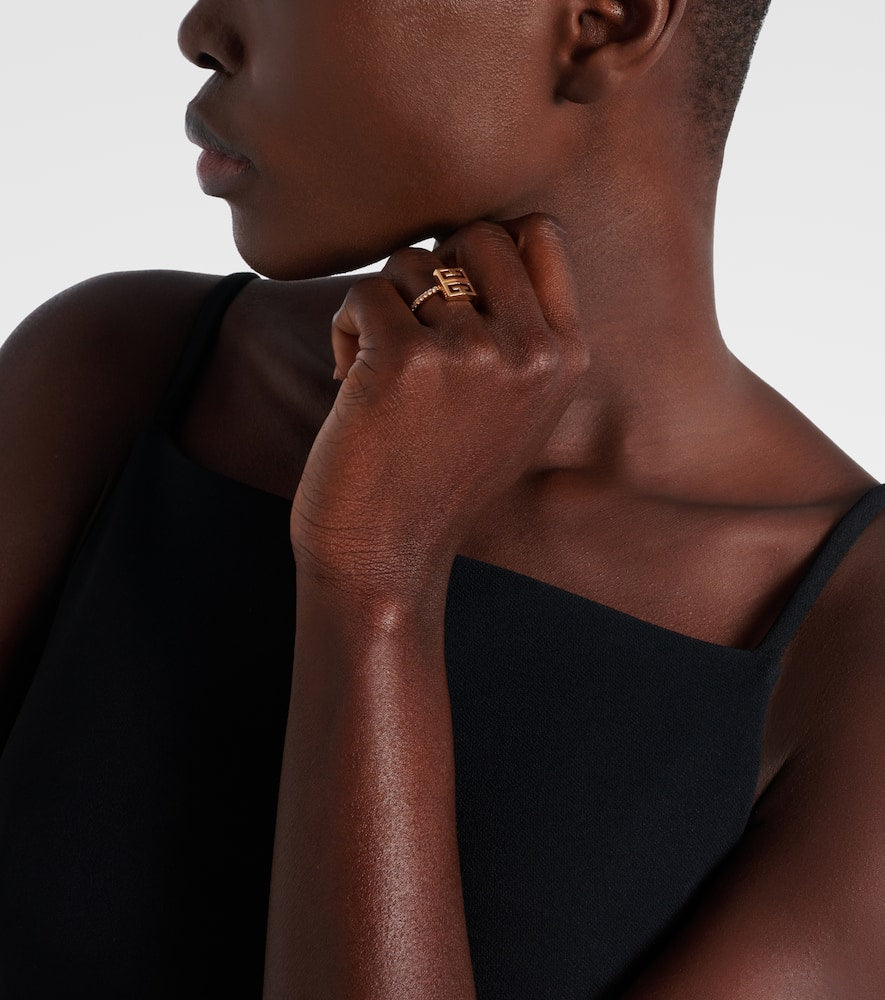 This 4G Swarovski®-embellished ring by Givenchy is a sleek and modern piece that captures the essence of contemporary elegance. The ring's sculptural, open form is expertly crafted from brass and adorned with a continuous line of shimmering Swarovski crystals. This ring feels both artistic and personal, a true statement of refined taste and a celebration of uncompromising quality. It is a versatile accessory that can be worn alone or stacked with other rings, symbolizing a confident and artistic approach to style.