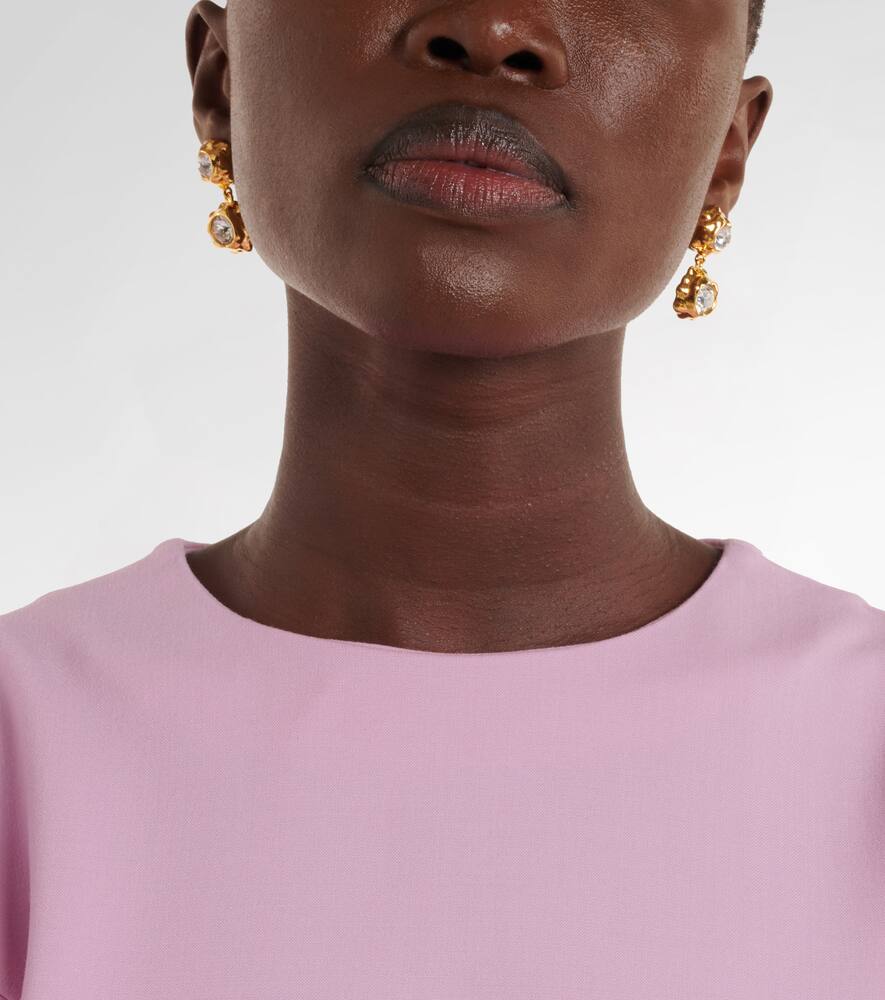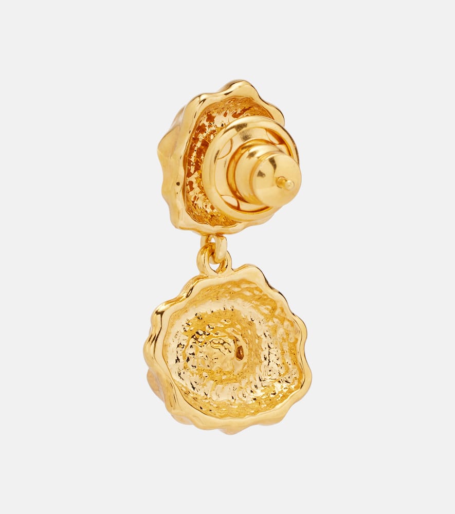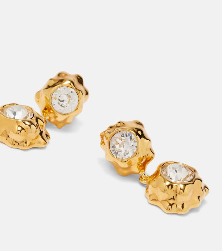 These Embellished drop earrings by Oscar de la Renta are a beautiful and artistic expression of modern elegance. The earrings feature a delicate and fluid design, expertly crafted from brass, glass, bronze, and yellow gold. They are adorned with a beautiful array of glass stones, adding a luxurious sparkle. The piece feels both organic and luxurious, a true statement of refined style. These earrings are a versatile accessory that can be worn for both everyday moments and special occasions.