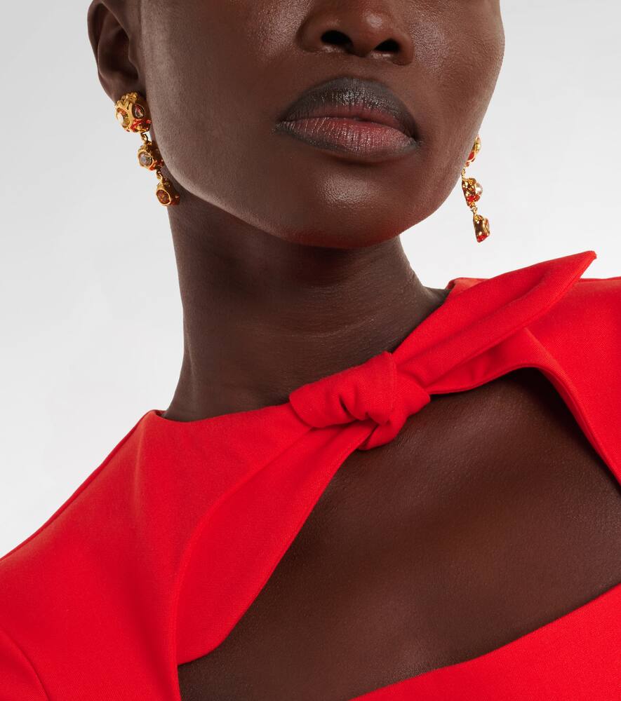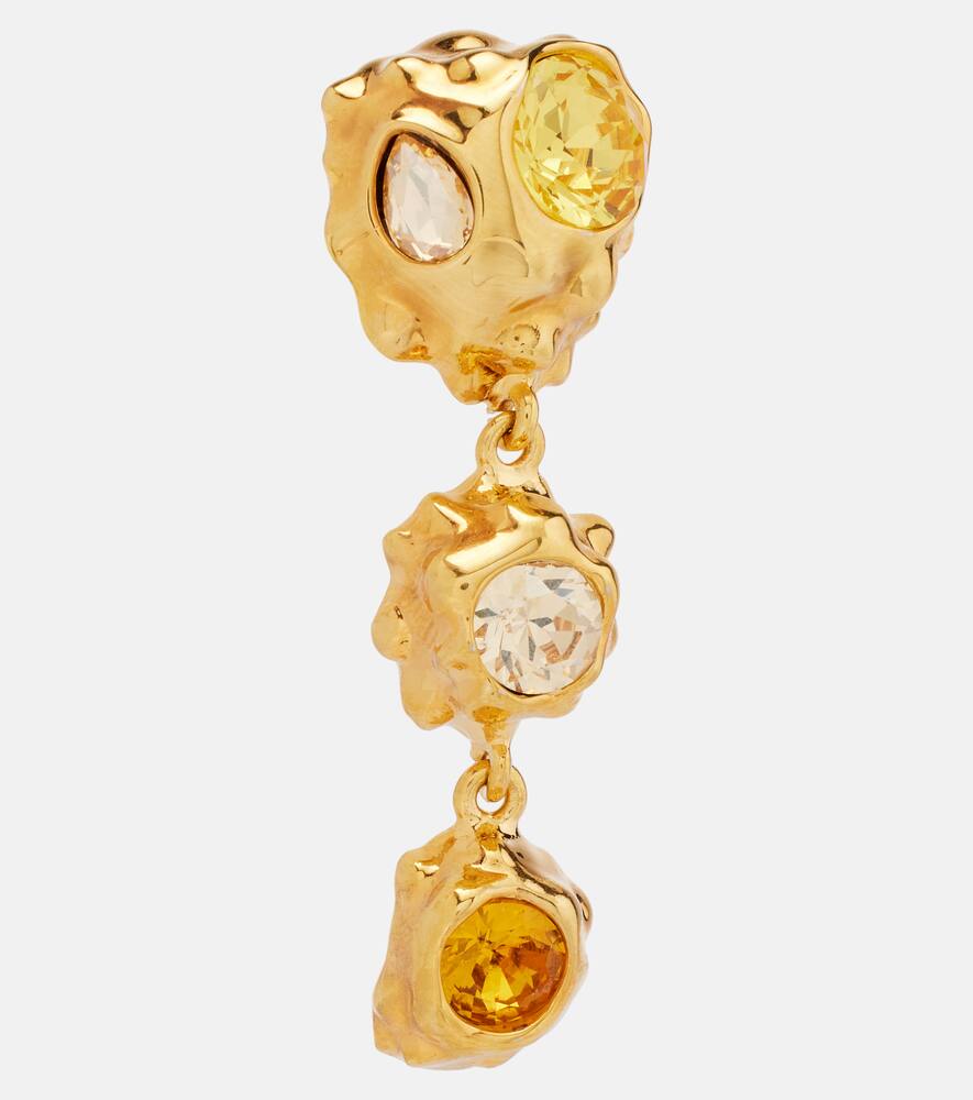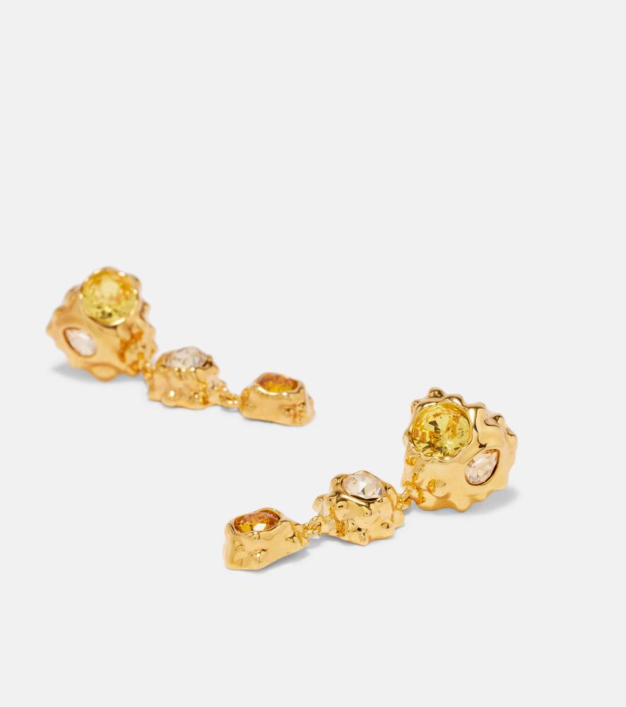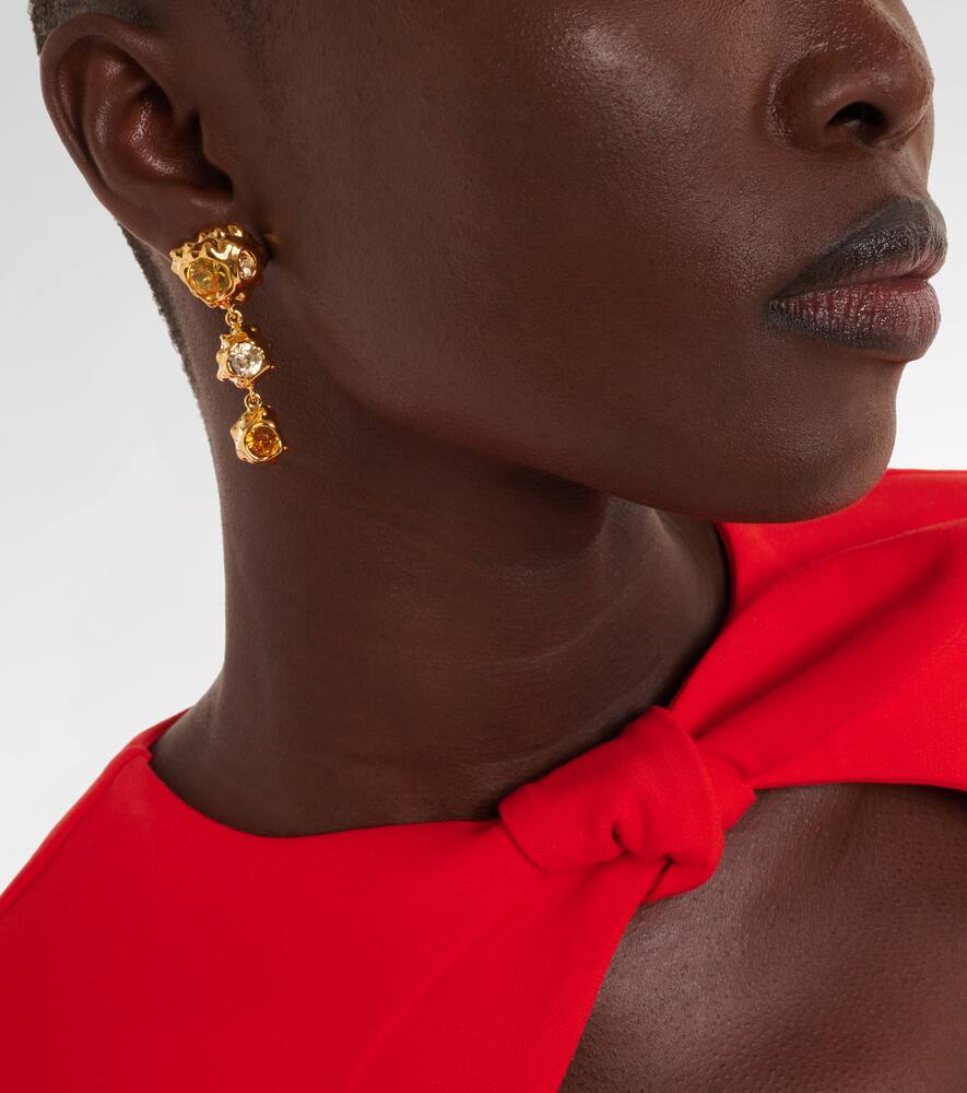 These Crystal-embellished drop earrings by Oscar de la Renta are a beautiful and artistic expression of modern elegance. The earrings feature a delicate and fluid design, expertly crafted from brass, glass, bronze, and yellow gold. They are adorned with a beautiful array of glass stones, adding a luxurious sparkle. The piece feels both organic and luxurious, a true statement of refined style. These earrings are a versatile accessory that can be worn for both everyday moments and special occasions.