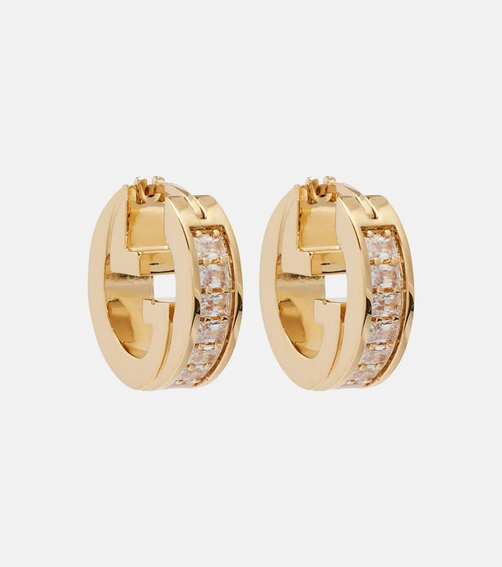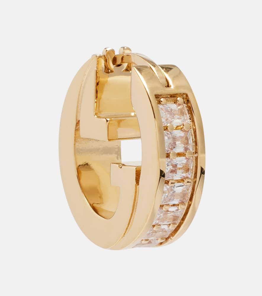These Gucci Blondie Mini embellished earrings by Gucci are a beautiful and artistic expression of modern elegance. The earrings feature a delicate and fluid design, expertly crafted from brass. They are adorned with a beautiful array of zircon stones, adding a luxurious sparkle. The piece feels both organic and luxurious, a true statement of refined style. These earrings are a versatile accessory that can be worn for both everyday moments and special occasions, symbolizing a confident approach to style.