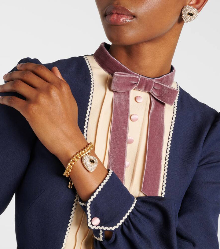 This Coeur Royal VLogo charm bracelet by Valentino is a whimsical yet glamorous piece that captures the essence of Parisian chic. The bracelet features a delicate chain expertly crafted from gold-plated brass, which holds a stunning VLogo charm. This is beautifully adorned with shimmering crystals, adding a luxurious sparkle. This piece feels both personal and luxurious, a true statement of refined taste and a celebration of life's most beautiful moments. It is an accessory that symbolizes joyful elegance and a confident approach to style.