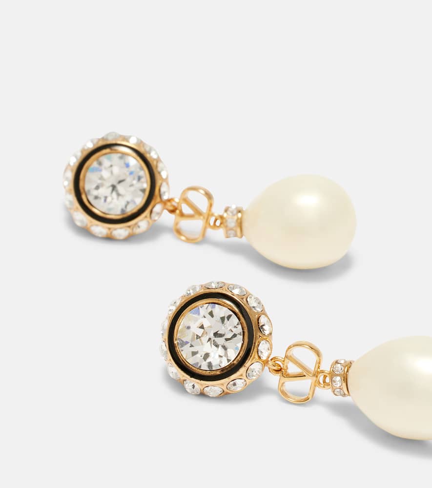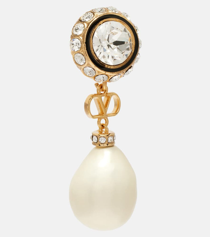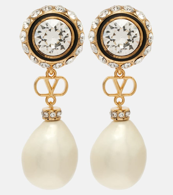 These VLogo embellished drop earrings by Valentino are a bold and iconic accessory that embodies the brand's signature glamour. The sleek design, featuring the unmistakable VLogo, is finished with a stunning gold-plated brass base and adorned with shimmering faux pearls. These earrings are a perfect statement piece for the modern woman who appreciates a blend of classic brand recognition and contemporary sparkle. They are the ideal finishing touch to elevate any ensemble, from a simple daytime look to a sophisticated evening outfit.