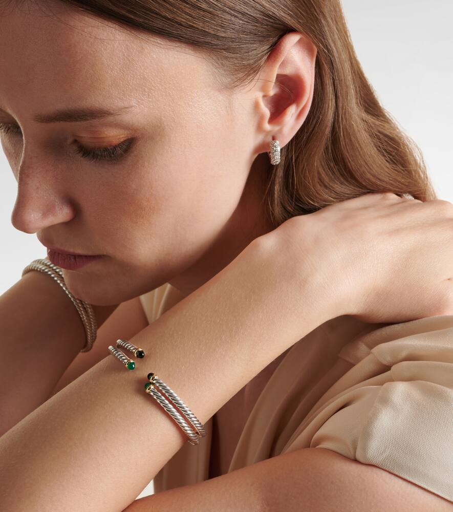 This Cable Flex sterling silver and 14kt gold cuff bracelet with onyxes by David Yurman is a beautiful and artistic expression of modern elegance. The bracelet features a unique, twisted cable design, expertly crafted from sterling silver and 14kt yellow gold. It is adorned with a stunning onyx stone, adding a luxurious sparkle. The piece feels both organic and luxurious, a true statement of refined style. This bracelet is a versatile accessory that can be worn for both everyday moments and special occasions, symbolizing a confident approach to style.