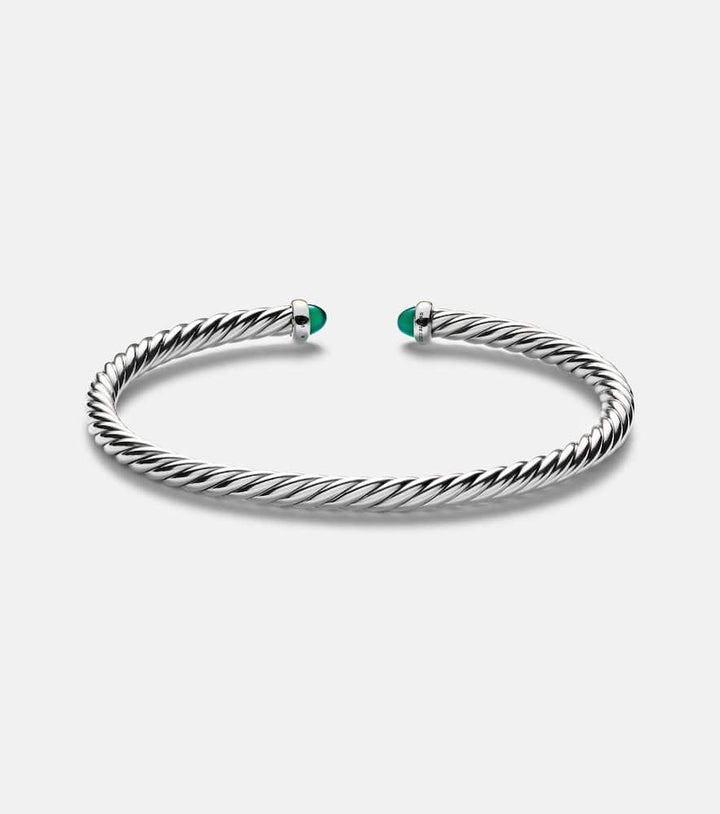 This Cable Flex sterling silver and 14kt gold cuff bracelet with onyxes by David Yurman is a beautiful and artistic expression of modern elegance. The bracelet features a unique, twisted cable design, expertly crafted from sterling silver and 14kt yellow gold. It is adorned with a stunning onyx stone, adding a luxurious sparkle. The piece feels both organic and luxurious, a true statement of refined style. This bracelet is a versatile accessory that can be worn for both everyday moments and special occasions, symbolizing a confident approach to style.