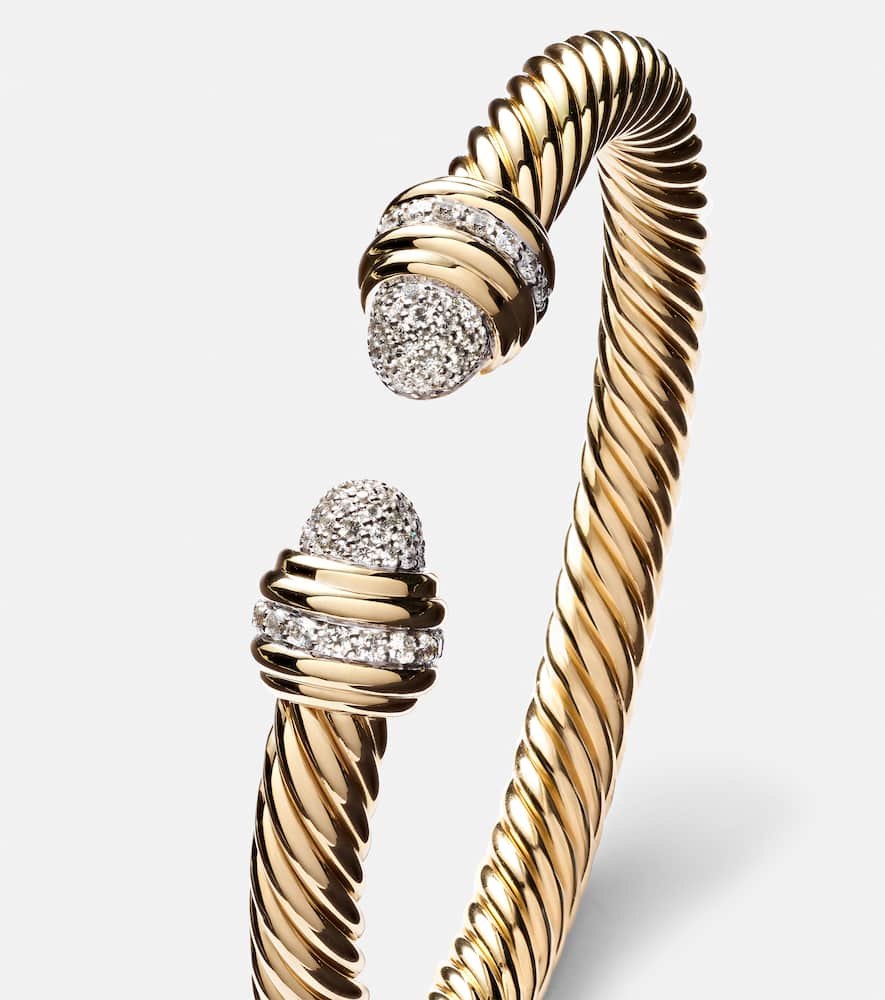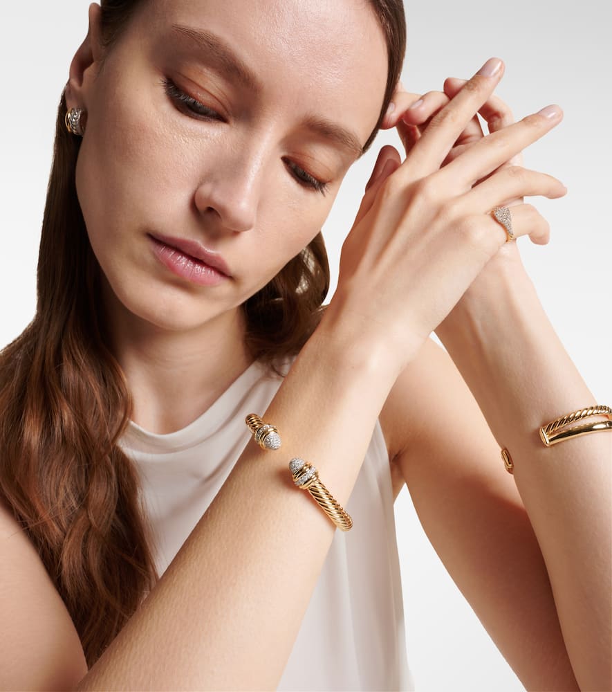 This Classic Cablespira 18kt gold cuff bracelet with diamonds by David Yurman is a beautiful and artistic expression of modern elegance. The bracelet features a unique, twisted cable design, expertly crafted from 18kt yellow gold. It is adorned with a brilliant pavé of natural diamonds, adding a luxurious sparkle. The piece feels both organic and luxurious, a true statement of refined style. This bracelet is a versatile accessory that can be worn for both everyday moments and special occasions, symbolizing a confident approach to style.