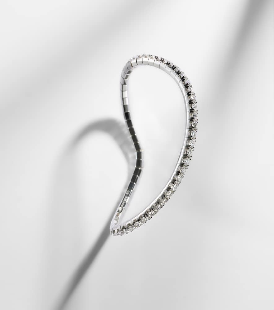 This 18kt white gold bracelet with diamonds by BuchererFine Jewellery is a striking masterpiece of timeless elegance and brilliance. The bracelet features 59 natural diamonds, with a total carat weight of 5.5ctw, each set to maximize its individual sparkle and create an uninterrupted line of light. The piece’s design embodies a powerful and sophisticated femininity, symbolizing enduring strength and unwavering beauty. Its substantial presence and exquisite craftsmanship make it a truly luxurious and impactful accessory.
