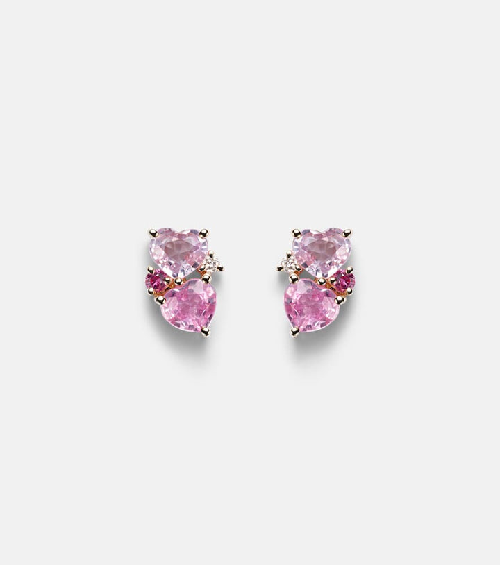 These earrings are crafted in Hong Kong from 14kt yellow gold. They feature six pink sapphires totaling 1.62ctw and two brilliant-cut diamonds totaling 0.02ctw. They have a max. width of 9mm (0.35").