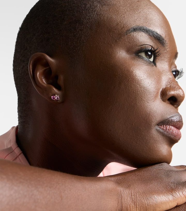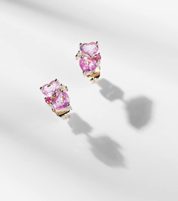 These 14kt gold earrings with sapphires and diamonds by Sydney Evan are a vibrant and sophisticated expression of modern elegance. The combination of rich pink sapphires and a single sparkling diamond creates a beautiful, harmonious contrast. The earrings feel both luxurious and playful, perfect for adding a pop of color to an evening or daytime look. They are a true testament to the brand's ability to blend classic gemstones with a contemporary aesthetic, symbolizing creativity and individuality.