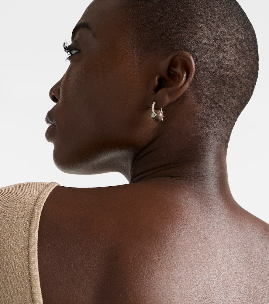 These earrings are made in Thailand from 14kt yellow gold. They feature 43 natural diamonds in a pavé setting totaling 0.17ctw and one turquoise stone totaling 0.4ct. The earrings have a length of 17mm (0.65"), a max. width of 10mm (0.4"), and an inner diameter of 11mm (0.45"). They also contain petrified wood beads.