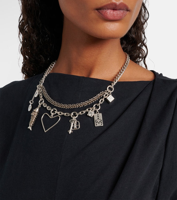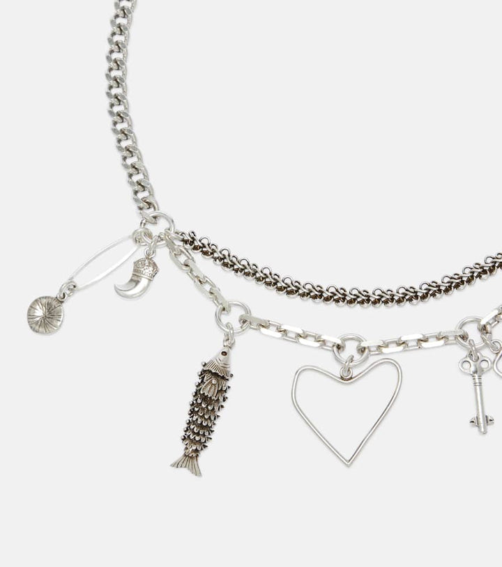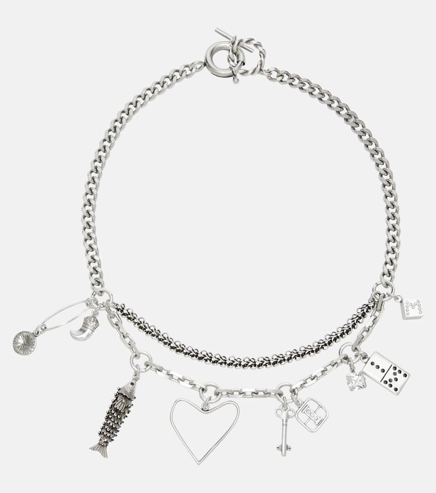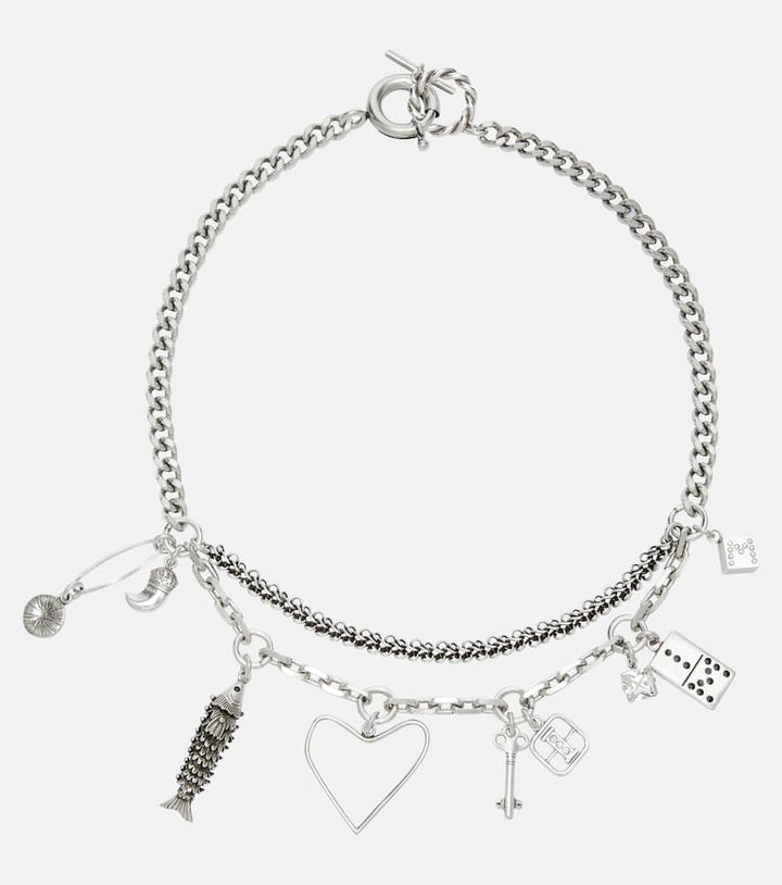 This Embellished chain necklace by Isabel Marant is a magnificent expression of contemporary glamour with a bohemian twist. The substantial chain, crafted from a blend of brass, tin, resin, and glass, is adorned with a captivating pendant, creating a piece that feels both luxurious and artfully constructed. The necklace has an edgy, yet refined aesthetic, perfect for adding a bold statement to any outfit. It is an accessory that celebrates individuality and creative expression.