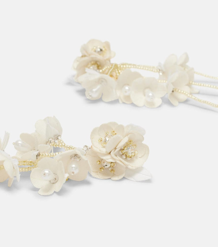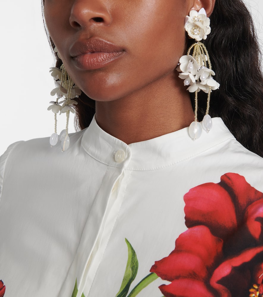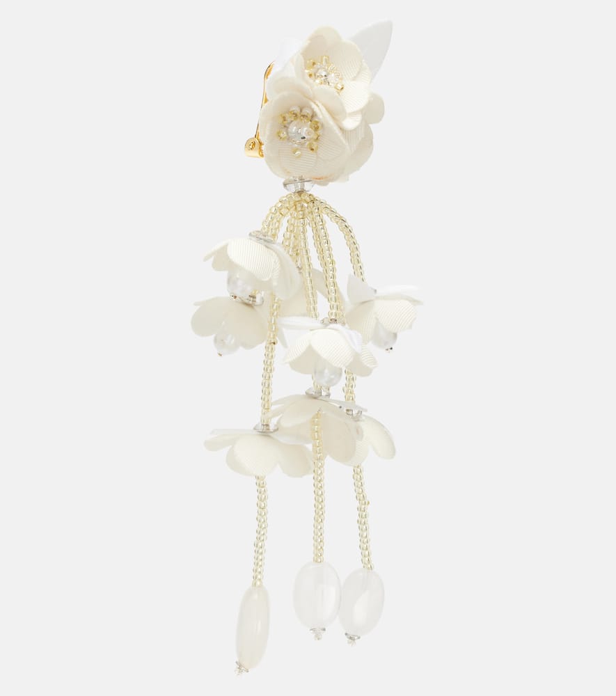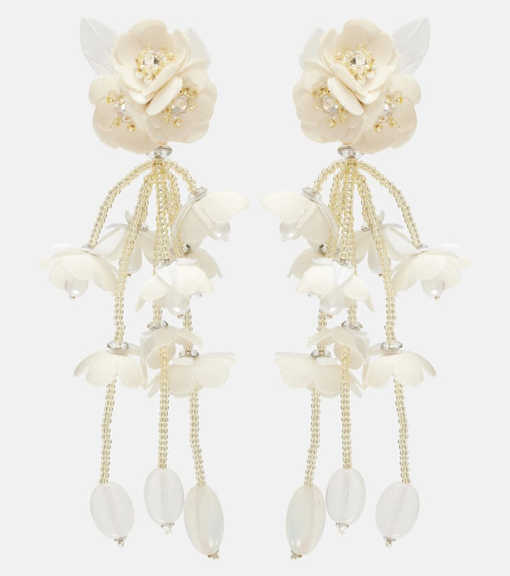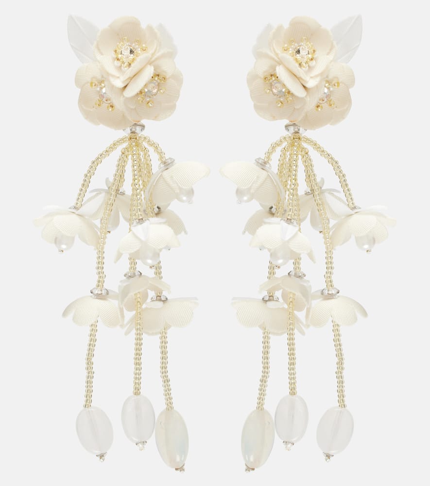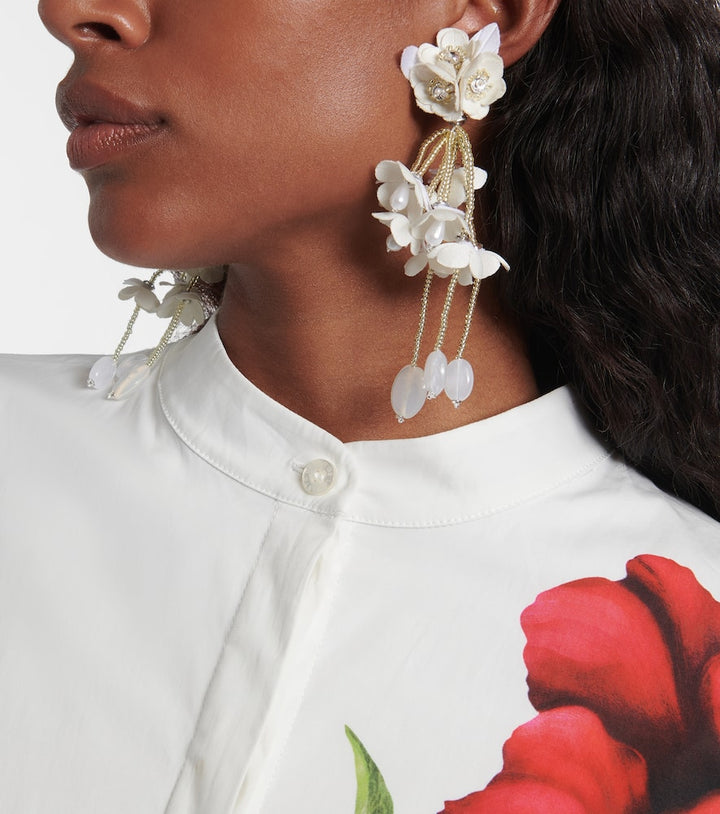 These Floral beaded drop earrings by Oscar de la Renta are a beautiful piece that merges romantic elegance with a touch of bohemian artistry. The intricate floral design, crafted from fabric and beads, creates a delicate and captivating silhouette. The earrings have a graceful and feminine vibe, perfect for adding a unique and sophisticated touch to any look. They are a testament to the brand's ability to create wearable works of art that are both beautiful and personal.