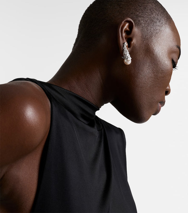 These Perlescent 18kt white gold earrings with diamonds and pearls by Yeprem are a magnificent and elegant piece that combines timeless beauty with a modern edge. The sculptural design, adorned with a continuous pavé of diamonds, gracefully holds a lustrous freshwater pearl. The earrings have a sense of ethereal luxury and a beautiful, fluid movement. They are a celebration of classic femininity and contemporary artistry, perfect for adding a touch of sophisticated drama to an evening look.