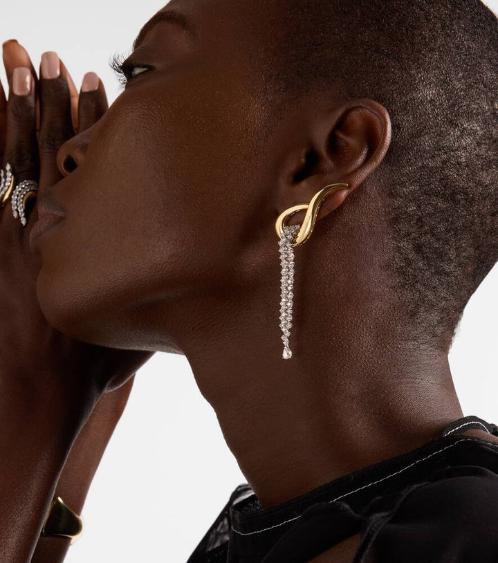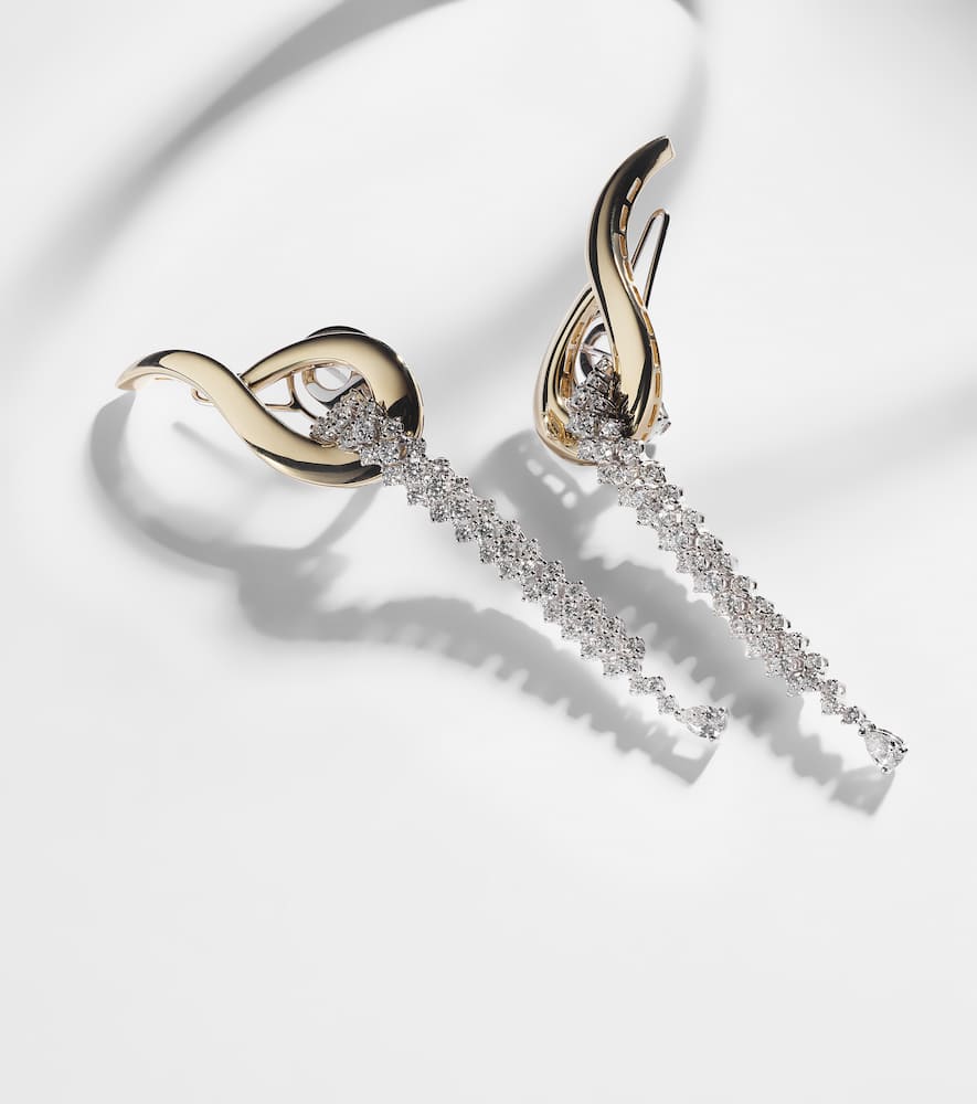 These Golden Strada 18kt white and yellow gold drop earrings with diamonds by Yeprem are a stunning testament to bold, sculptural design and luminous brilliance. The dynamic, fluid form is expertly crafted, with one half in rich yellow gold and the other in cool white gold, creating a captivating two-tone effect. A magnificent cascade of pear-shaped and round-cut natural diamonds adorns the earrings, adding a breathtaking sparkle. They are a statement of modern luxury, symbolizing strength, artistry, and confident elegance.