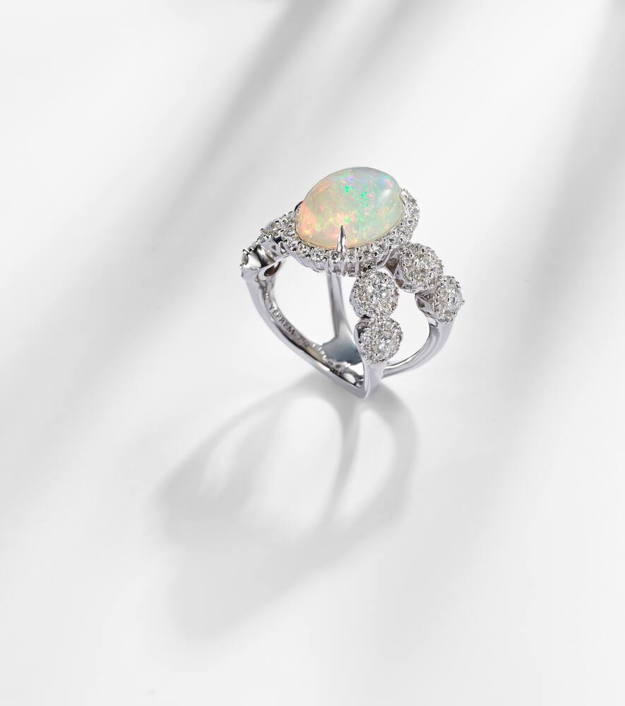 Made in Lebanon from 18kt white gold, this ring features one round-cut opal and 96 natural, round-cut diamonds in prong and pavé settings with a VVS-VS clarity and F-G color grade, totaling 1.76ctw. It has a max. width of 16mm (0.65").