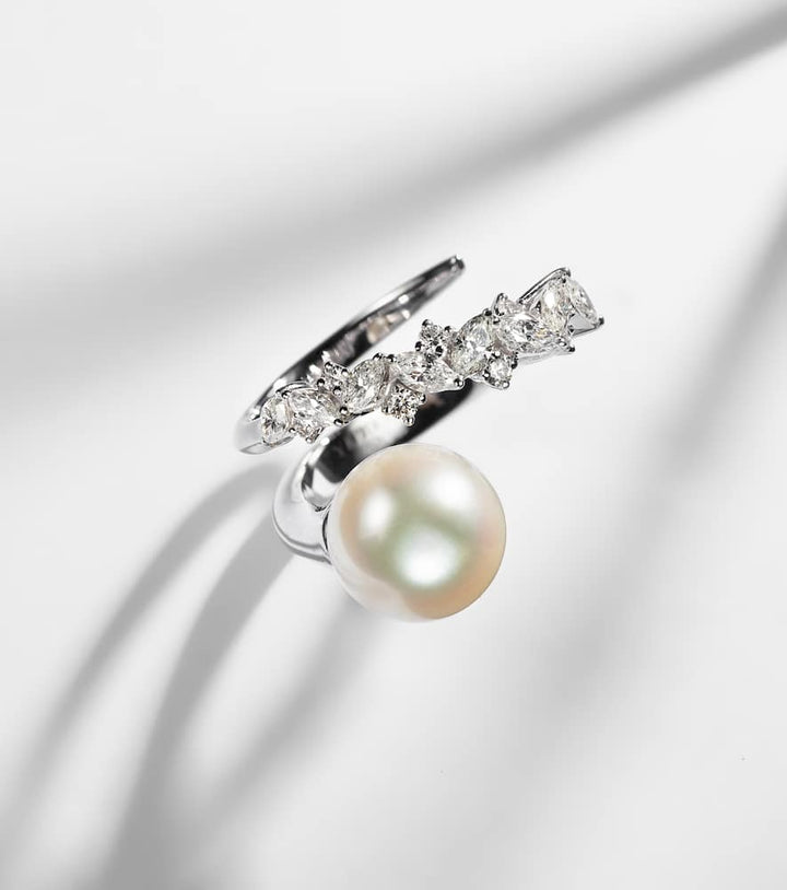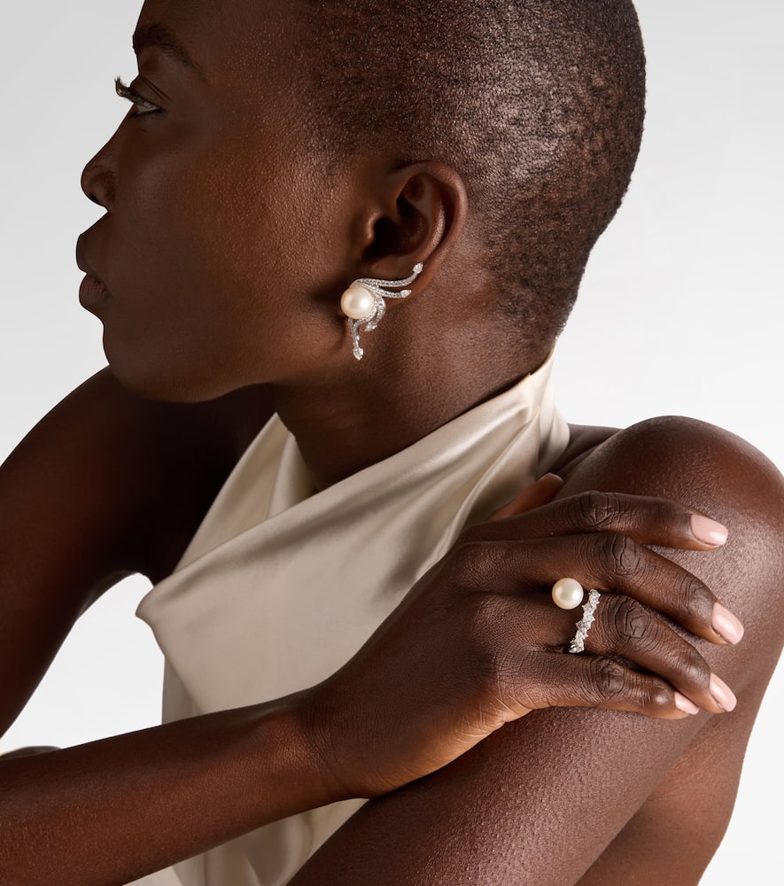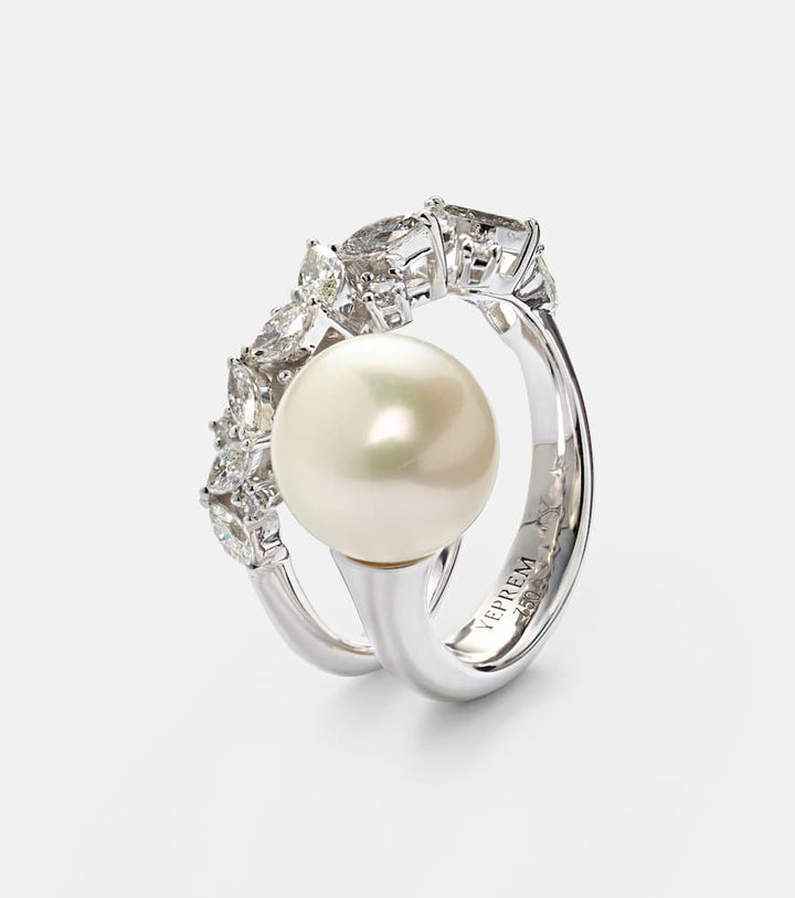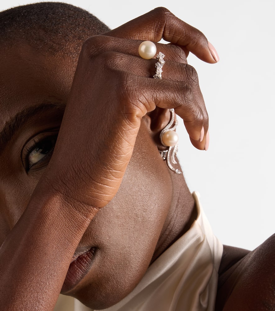 This Pearlescent 18kt white gold ring with diamonds and pearl by Yeprem is a beautiful piece that embodies a sense of modern elegance and delicate luxury. The ring's fluid, sculptural form is expertly crafted to hold a magnificent central freshwater pearl, perfectly complemented by a surrounding pavé of natural diamonds. The piece feels both organic and refined, a true statement of quiet luxury. It symbolizes inner beauty, grace, and a sophisticated approach to personal style.