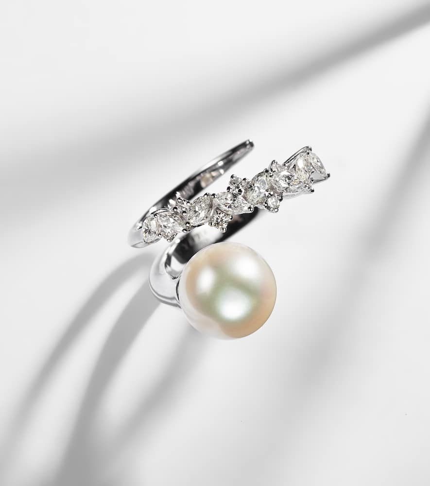 Pearlescent 18kt white gold ring with diamonds and pearl