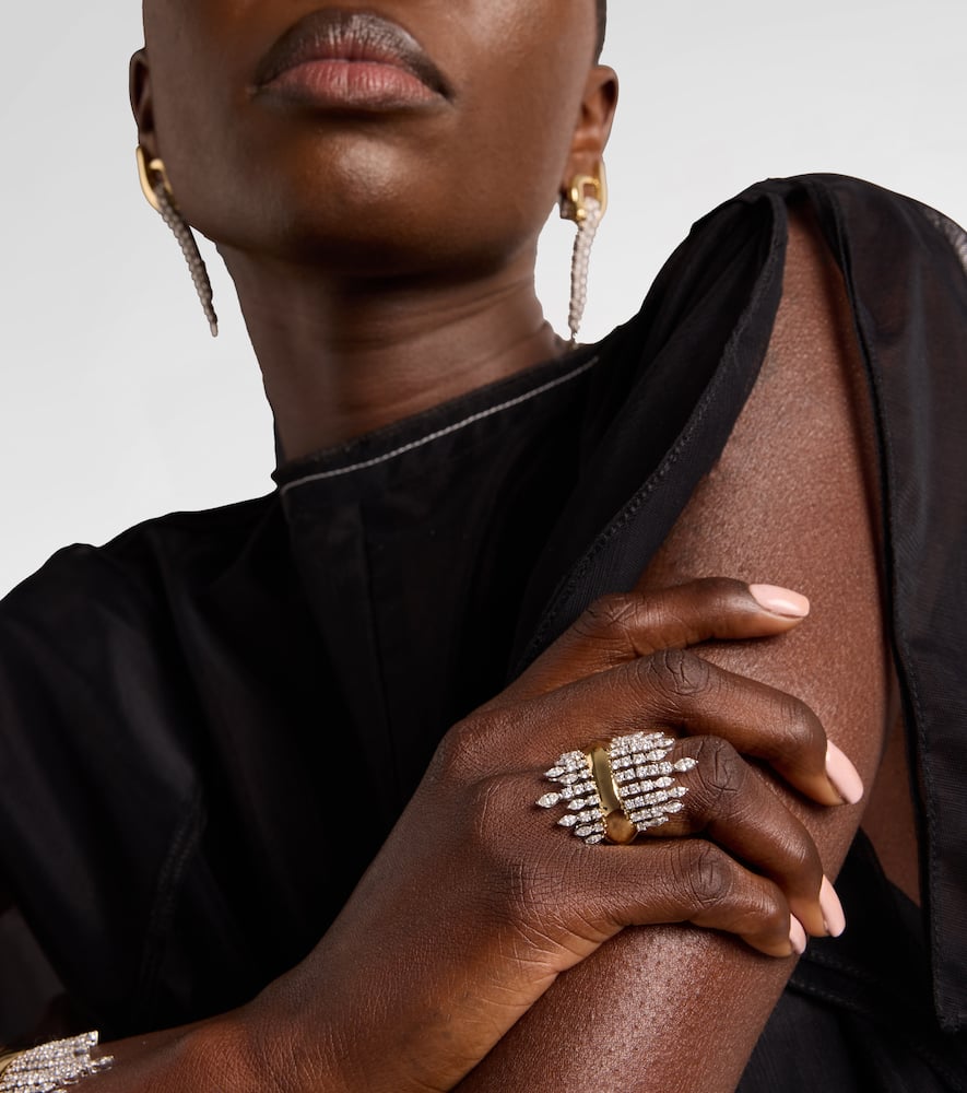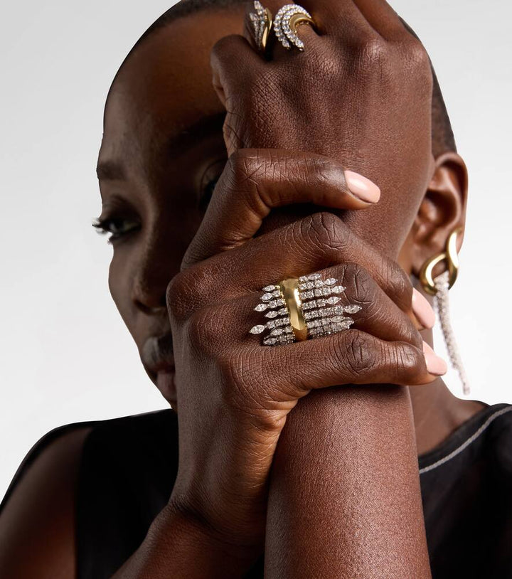 This Golden Strada 18kt gold ring with diamonds by Yeprem is a breathtaking masterpiece of sculptural design and opulent detail. The ring’s bold, open form is adorned with a dynamic arrangement of marquise-cut and round-cut natural diamonds, creating a mesmerizing sparkle that catches the light from every angle. The piece feels both powerful and elegant, a true statement of refined luxury. This ring symbolizes confident style, artistry, and the beautiful fusion of a precious metal with a radiant gem.