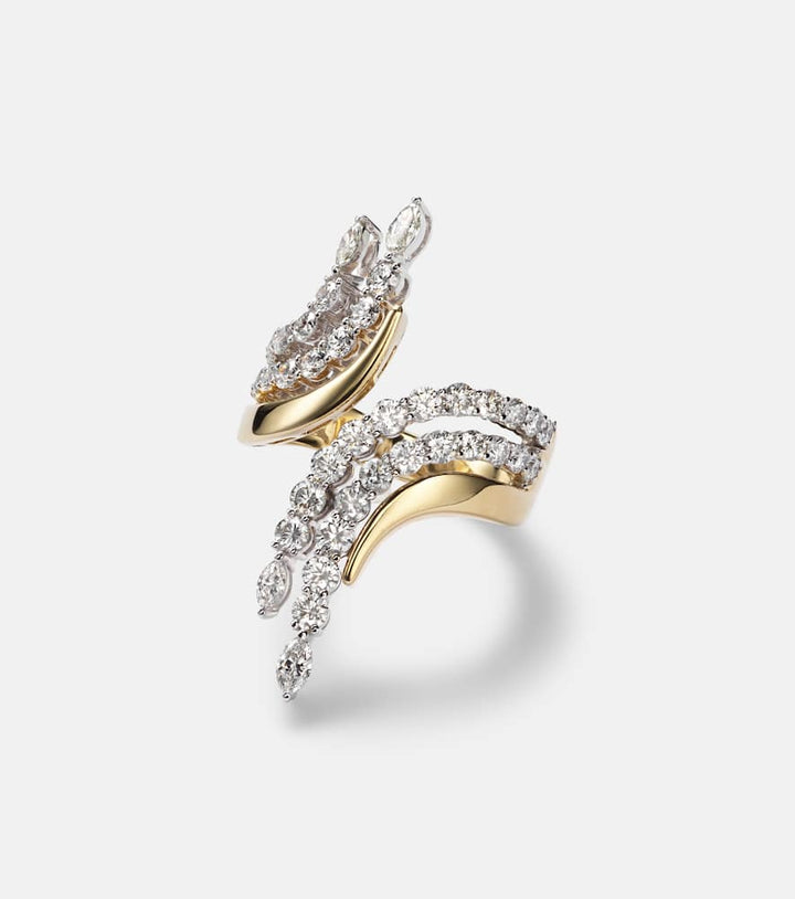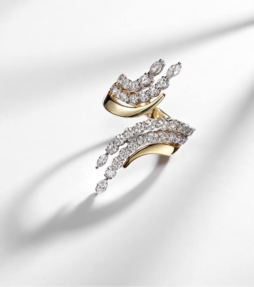 This Golden Strada 18kt gold ring with diamonds by Yeprem is a breathtaking masterpiece of sculptural design and opulent detail. The ring’s bold, open form is adorned with a dynamic arrangement of marquise-cut and round-cut natural diamonds, creating a mesmerizing sparkle that catches the light from every angle. The piece feels both powerful and elegant, a true statement of refined luxury. This ring symbolizes confident style, artistry, and the beautiful fusion of a precious metal with a radiant gem.