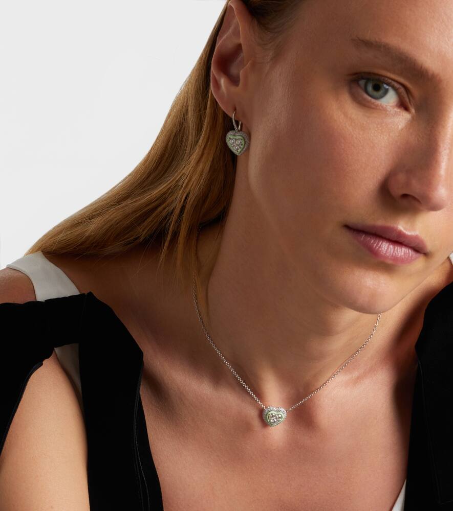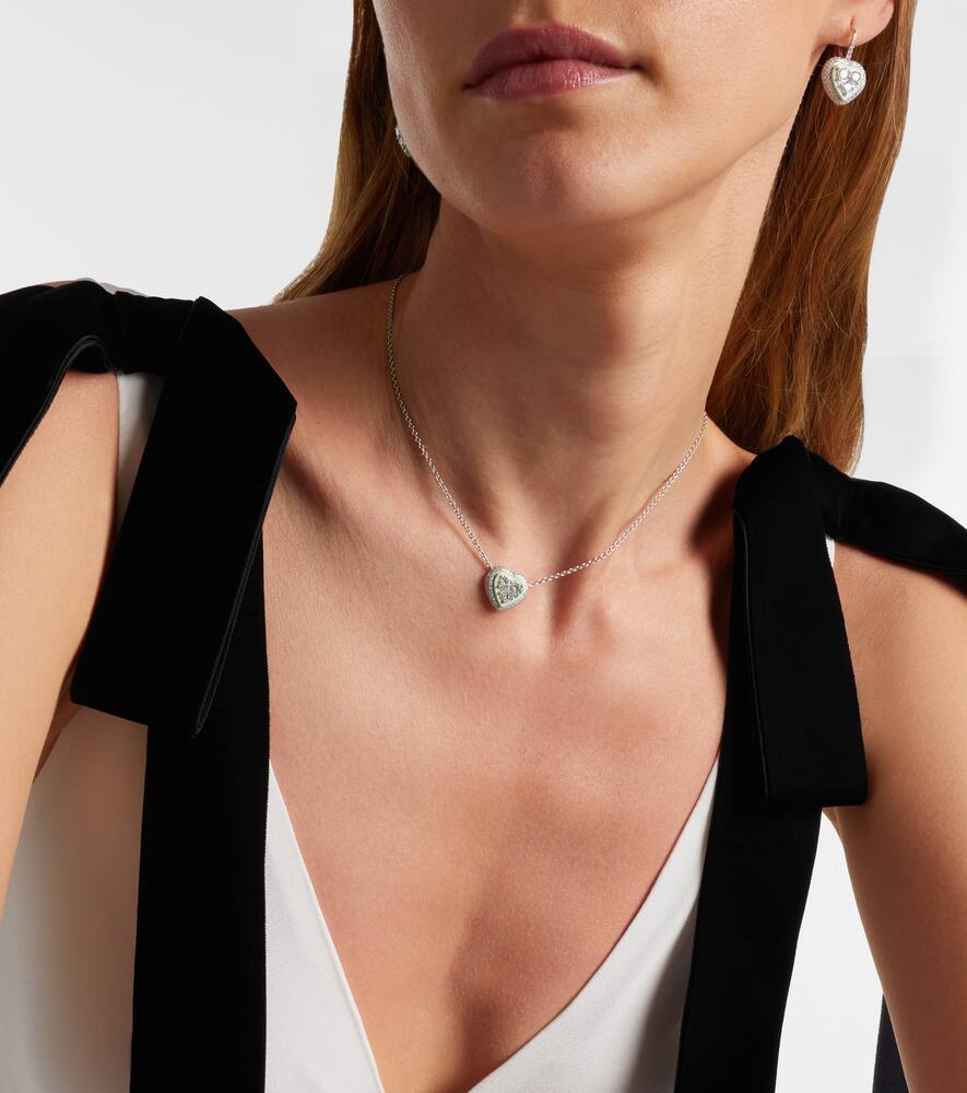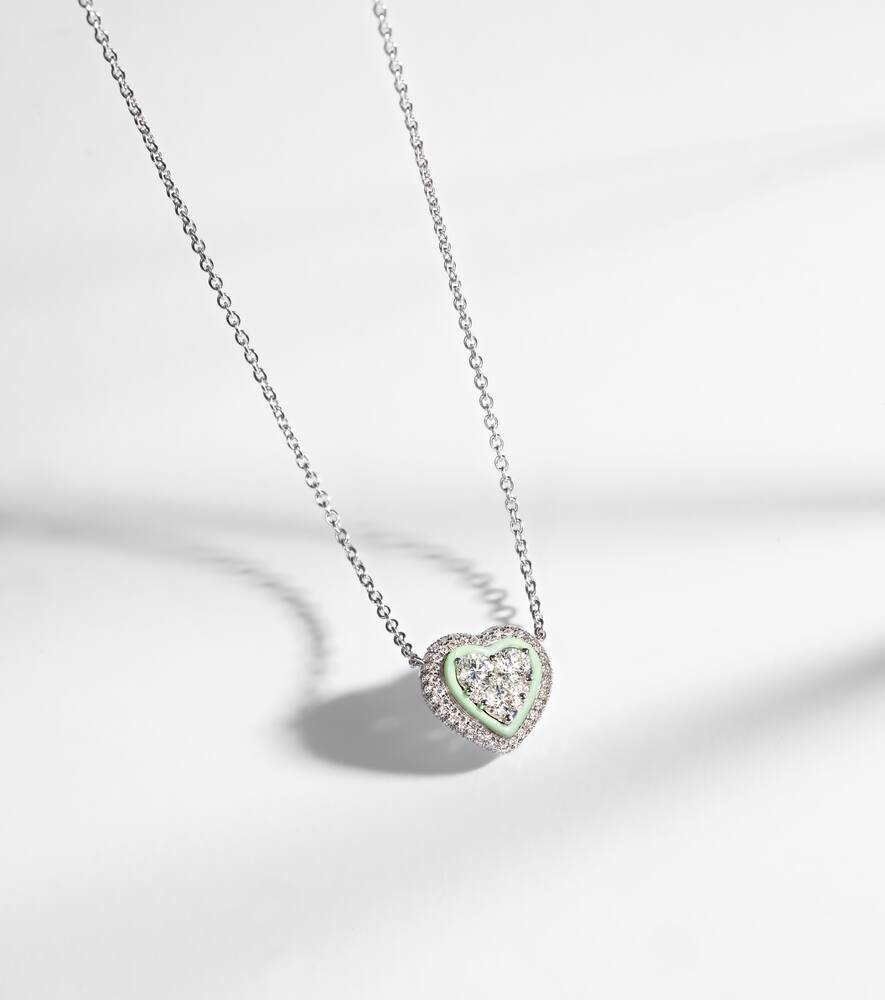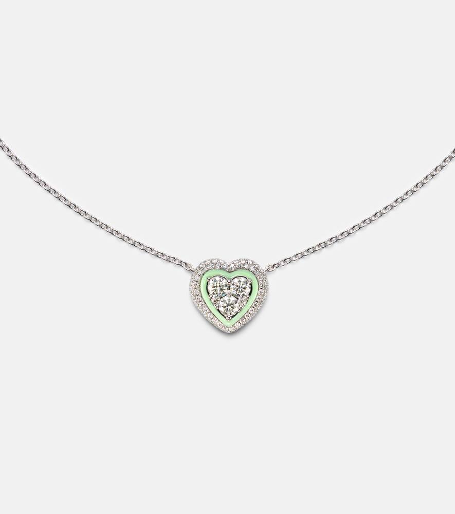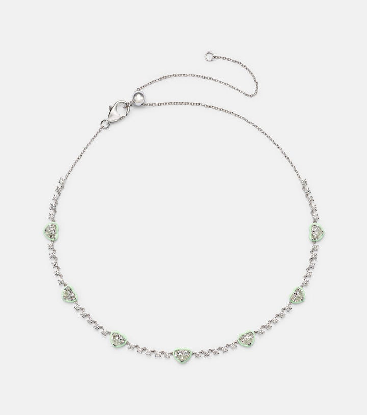 This adjustable necklace is made in India from 18kt white gold. It features 1.16 carats of heart-shaped diamonds with VS clarity and G-J color. It has a length of 41cm (16") and a width of 1mm (0.05"). The pendant has a length of 14mm (0.55") and a width of 13mm (0.5").