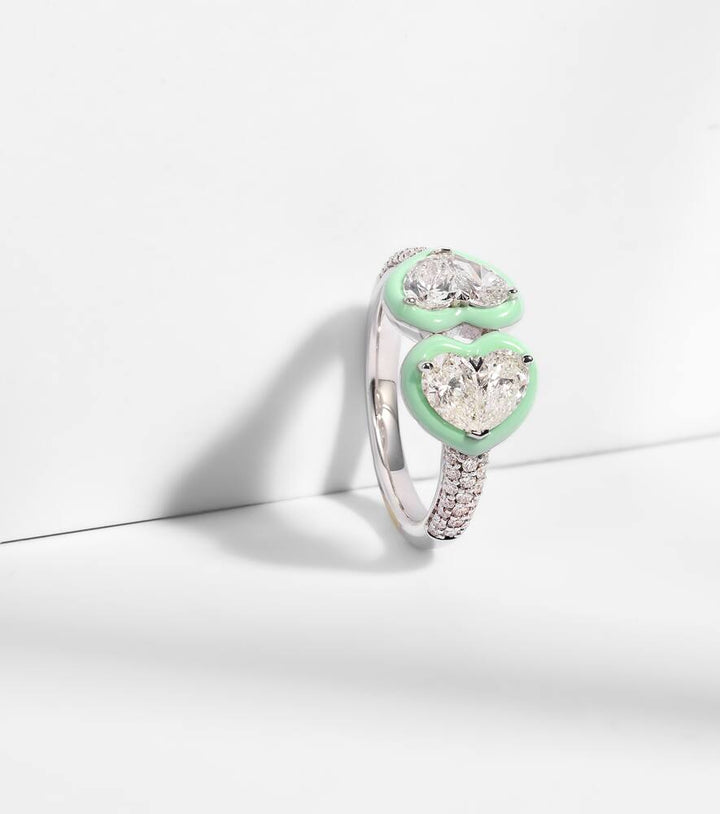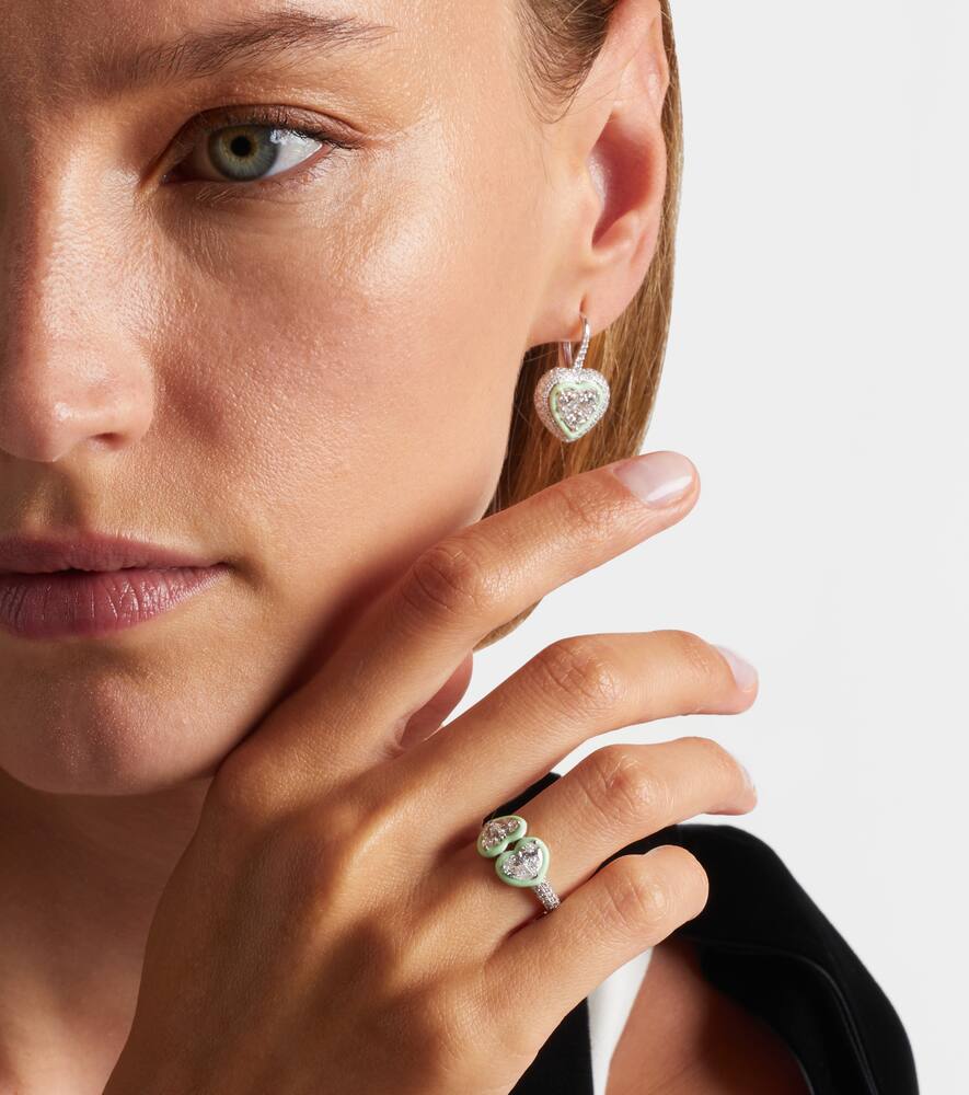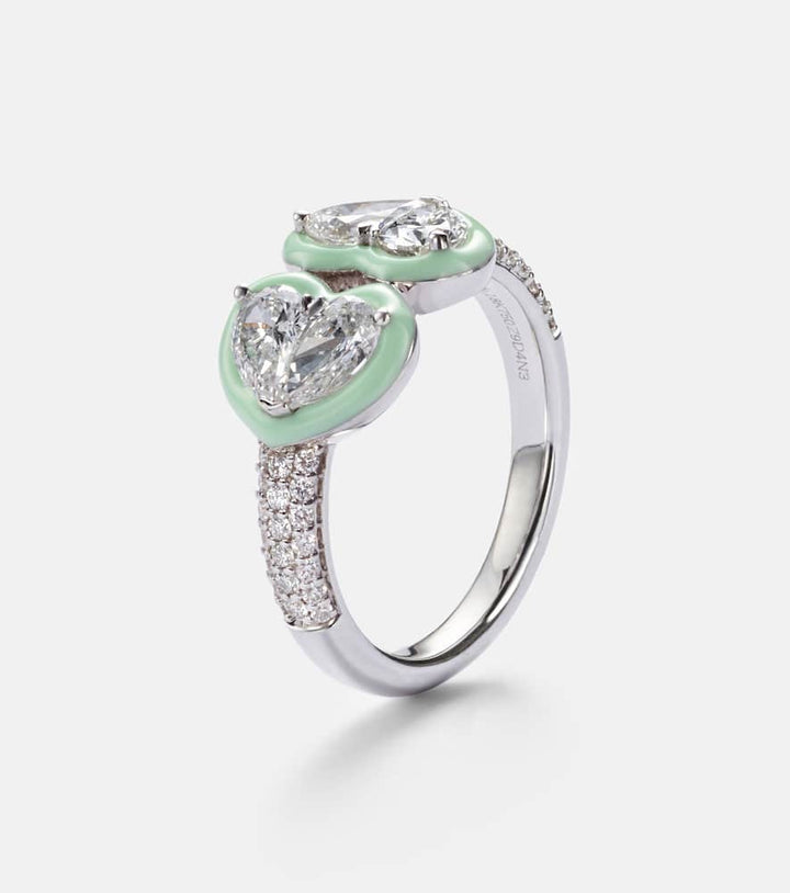 This 18kt white gold and enamel ring with diamonds by Kamyen is a fun and whimsical piece. Made in India from 18kt white gold and enamel, this ring features a stunning array of diamonds with a total carat weight of 1.2. The design is a celebration of a playful and modern aesthetic and is perfect for adding a touch of sophisticated charm to your look. It can be worn on its own for a subtle statement or stacked with other rings for a bolder, more personalized style.