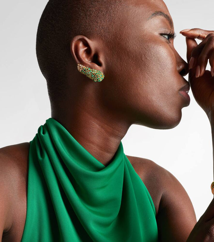 These Scatter 18kt gold earrings with emeralds and diamonds by Ananya are a magnificent and opulent statement. Made in India from 18kt yellow gold, these earrings are a breathtaking masterpiece, combining the beautiful luster of gold with the brilliant sparkle of emeralds and diamonds. They feature 3.52 carats of emeralds and 0.63 carats of diamonds. The design is a celebration of a sophisticated and graceful style and is perfect for adding a touch of high-end glamour to your look.
