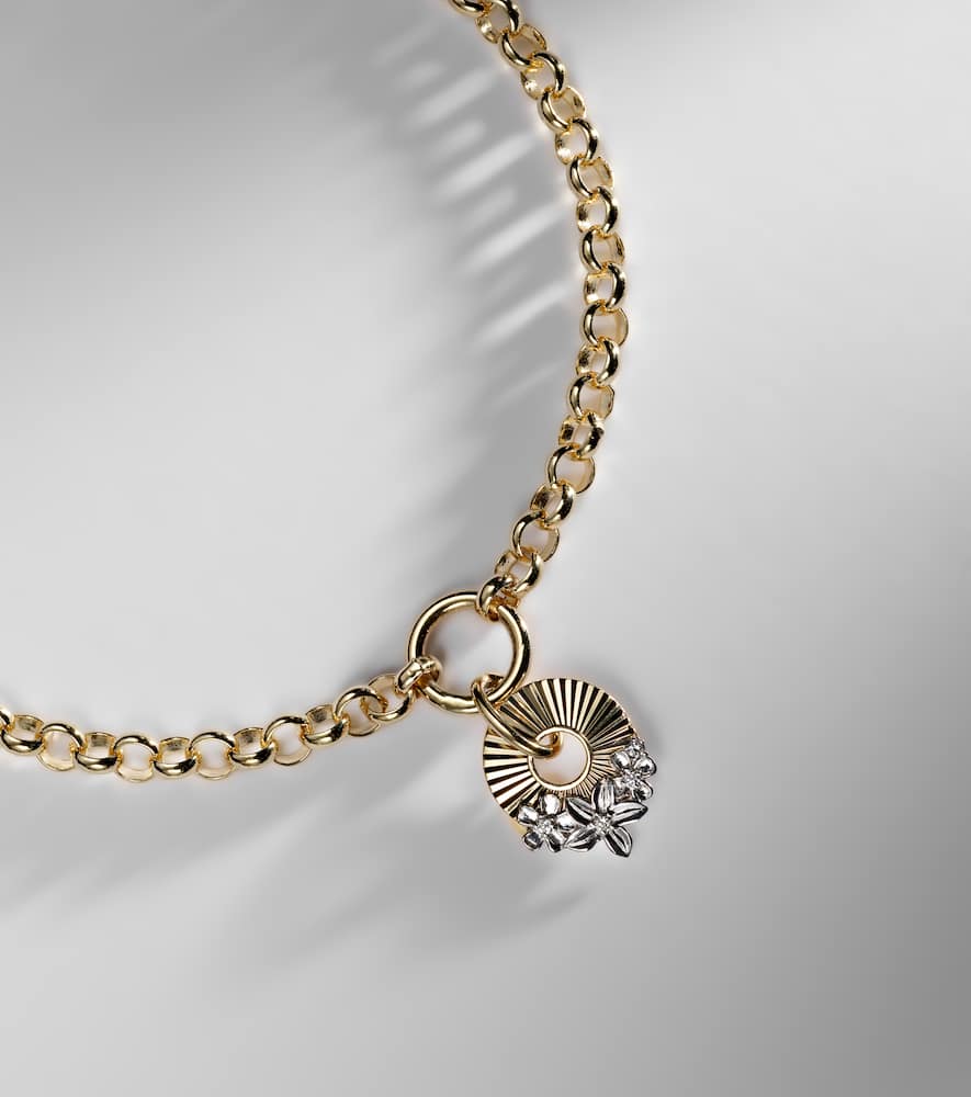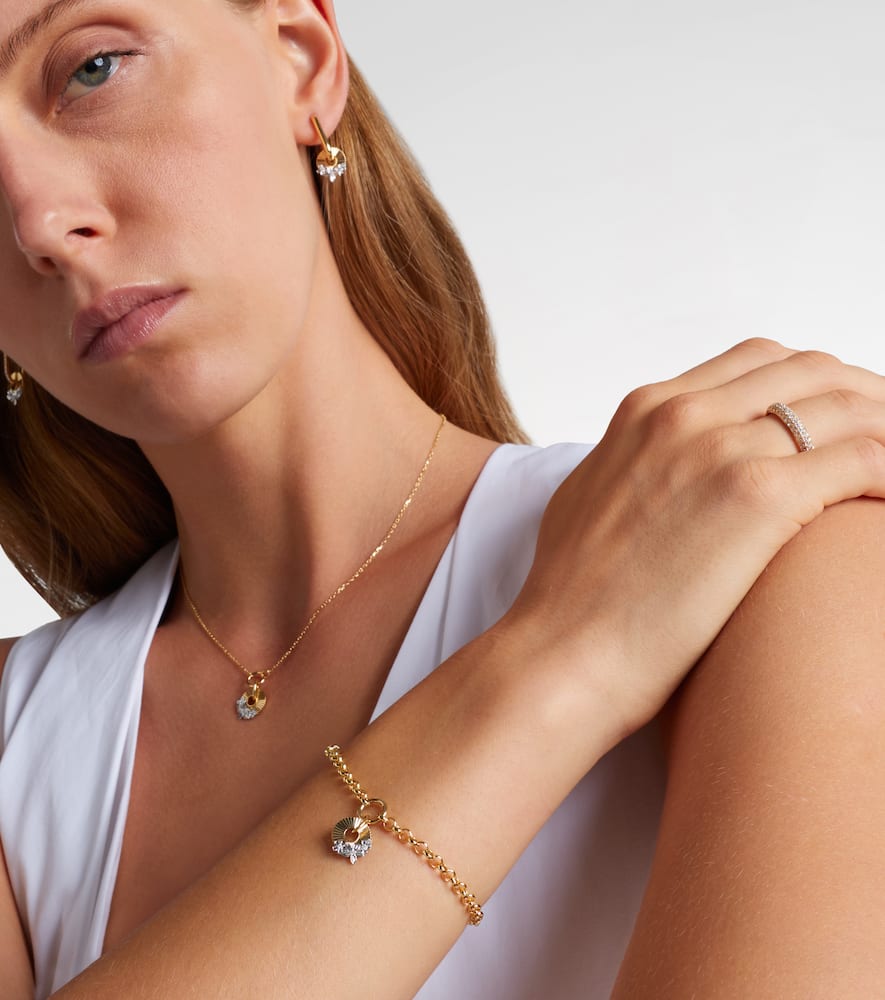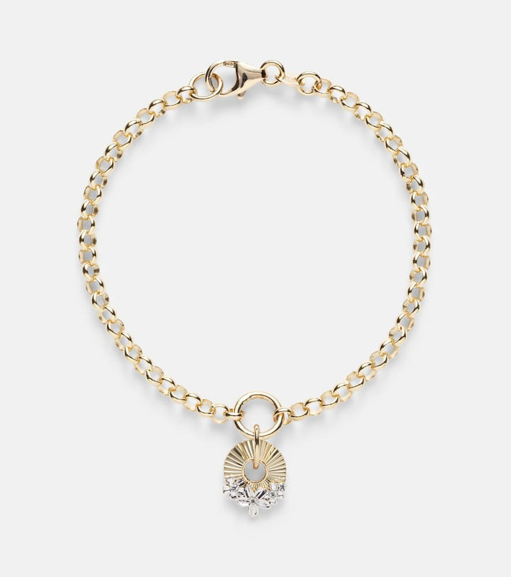 This bracelet is made in the USA from 18kt yellow gold and 18kt white gold with a lobster-clasp fastening. It features diamonds with a total carat weight of 0.024. It has an open length of 17cm (6.5") and a width of 3mm (0.1"). The pendant has a length of 15mm (0.6") and a width of 10mm (0.4").