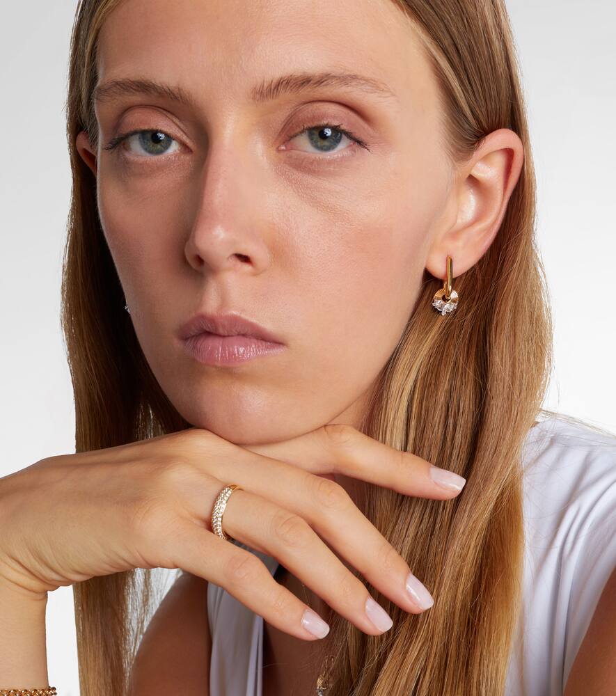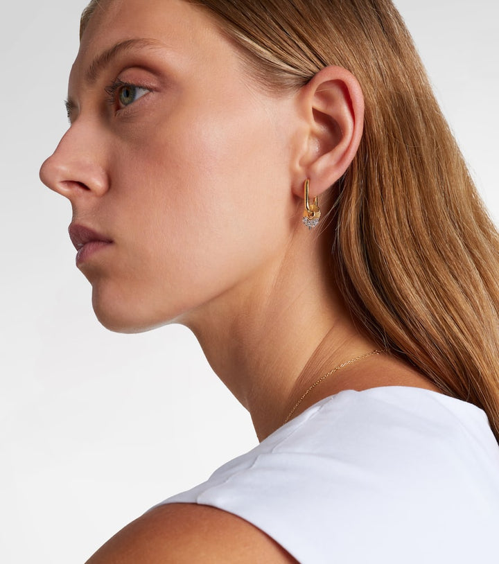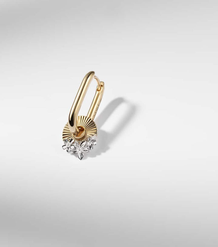 This earring is made in the USA from 18kt yellow gold. It features diamonds with a total carat weight of 0.024. It has a length of 25mm (1"), a max width of 10mm (0.4"), and an inner diameter of 6mm (0.25").