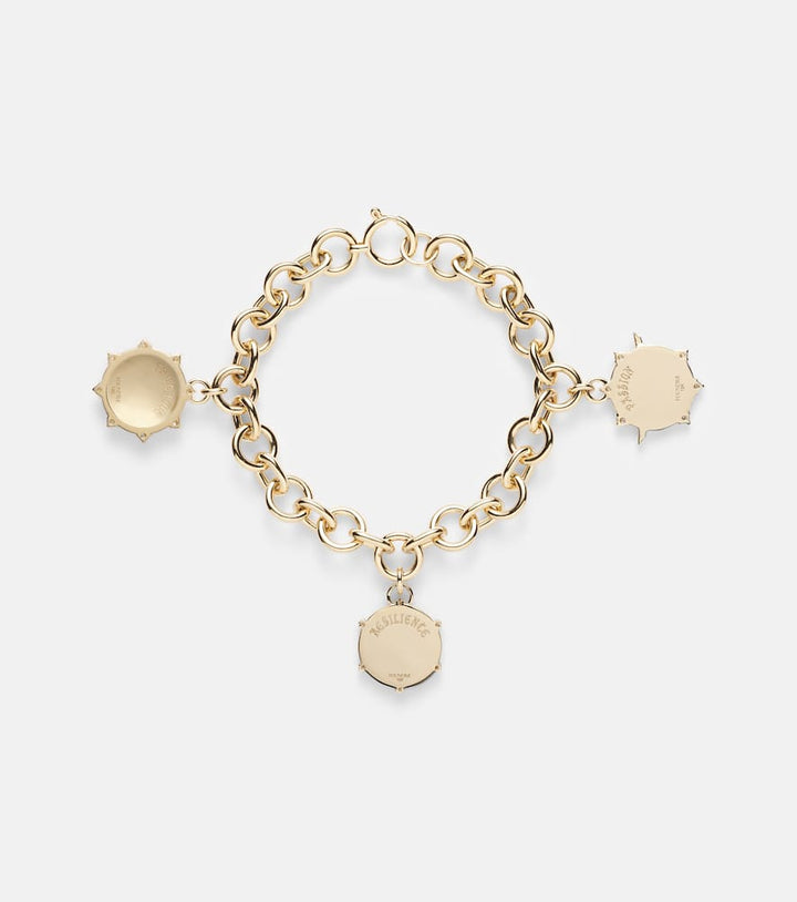 This Resilience and Blossom 18kt gold bracelet with diamonds by FoundRae is a modern and minimalist piece. Made in the USA from 18kt yellow gold, this bracelet features a sleek chain adorned with a delicate pendant with diamonds. The design is a beautiful blend of a timeless aesthetic and modern luxury, perfect for adding a touch of refined sparkle to your daily look. It can be worn on its own for a subtle statement or layered with other pieces for a bolder, more personalized style.