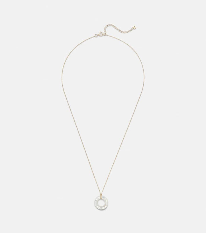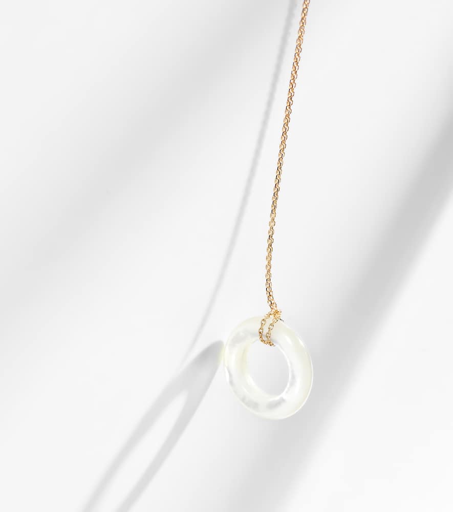 This adjustable necklace is made in the USA from 14kt yellow gold. It features mother-of-pearl with a total carat weight of 6.2. It has a length of 44.5-49.5cm (17.5-19.5") and a width of 1mm (0.05"). The pendant has a diameter of 15mm (0.6").