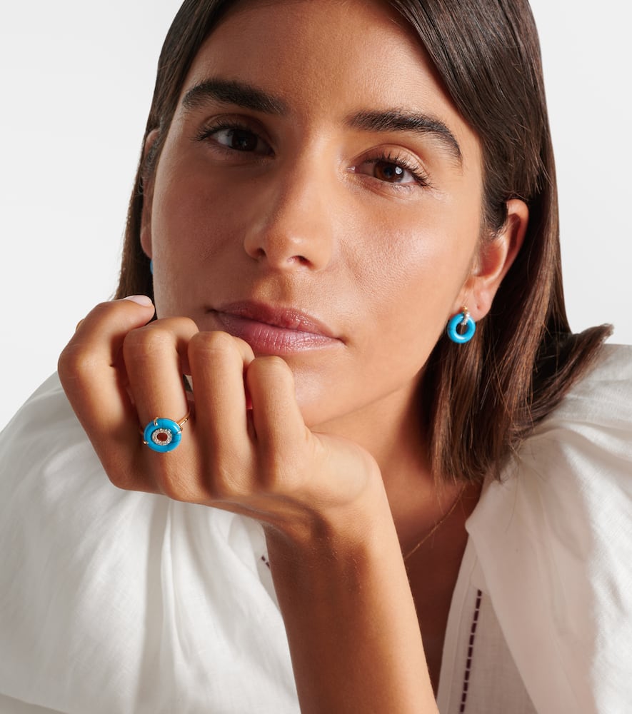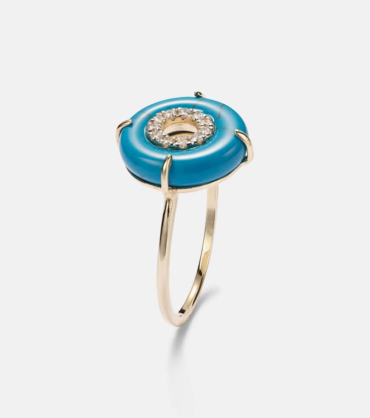 This 14kt gold ring with turquoise and diamonds by Mateo is a magnificent and opulent statement piece. Made in the USA from 14kt yellow gold, this ring is a breathtaking masterpiece. It features a stunning turquoise with a total carat weight of 3.5, surrounded by 0.11 carats of diamonds. The design is a celebration of a sophisticated and graceful style and is perfect for adding high-end sparkle to any ensemble.