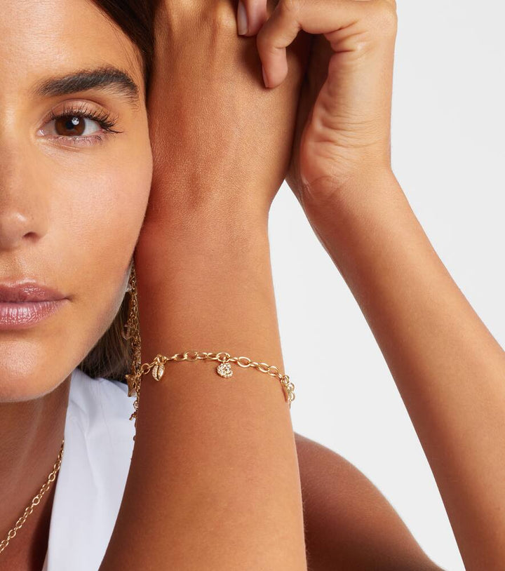This 14kt gold charm bracelet with diamonds by Sydney Evan is a modern and minimalist piece. Made in Thailand from 14kt yellow gold, this bracelet features a sleek chain adorned with a delicate charm and a total carat weight of 0.11 of diamonds. The design is a beautiful blend of a timeless aesthetic and modern luxury, perfect for adding a touch of refined sparkle to your daily look. It can be worn on its own for a subtle statement or layered with other pieces for a bolder, more personalized style.