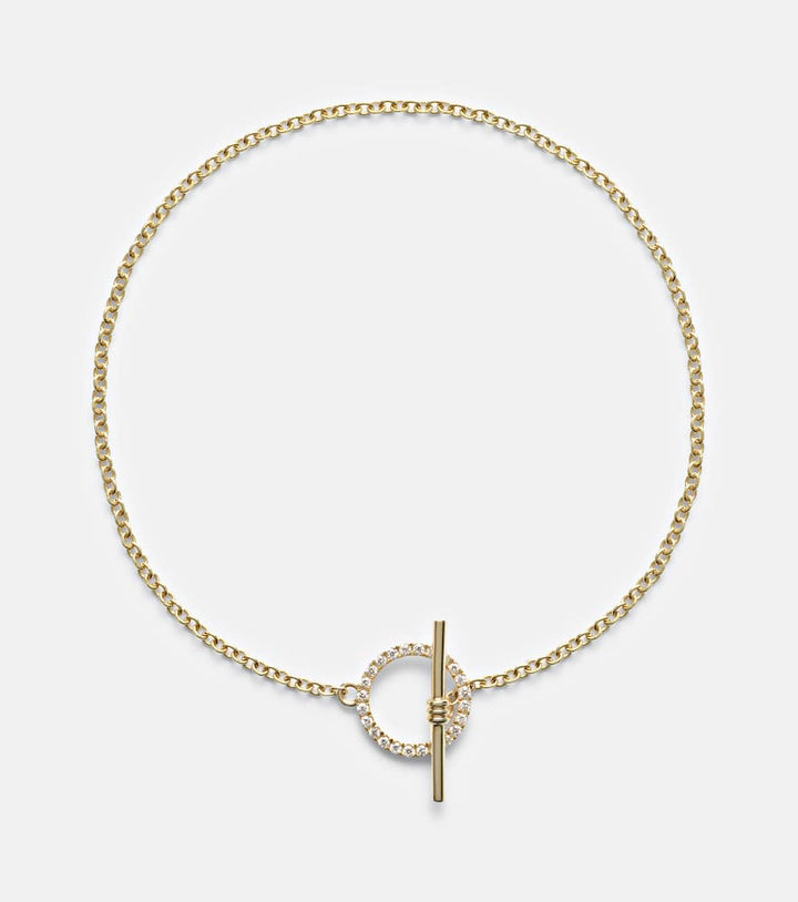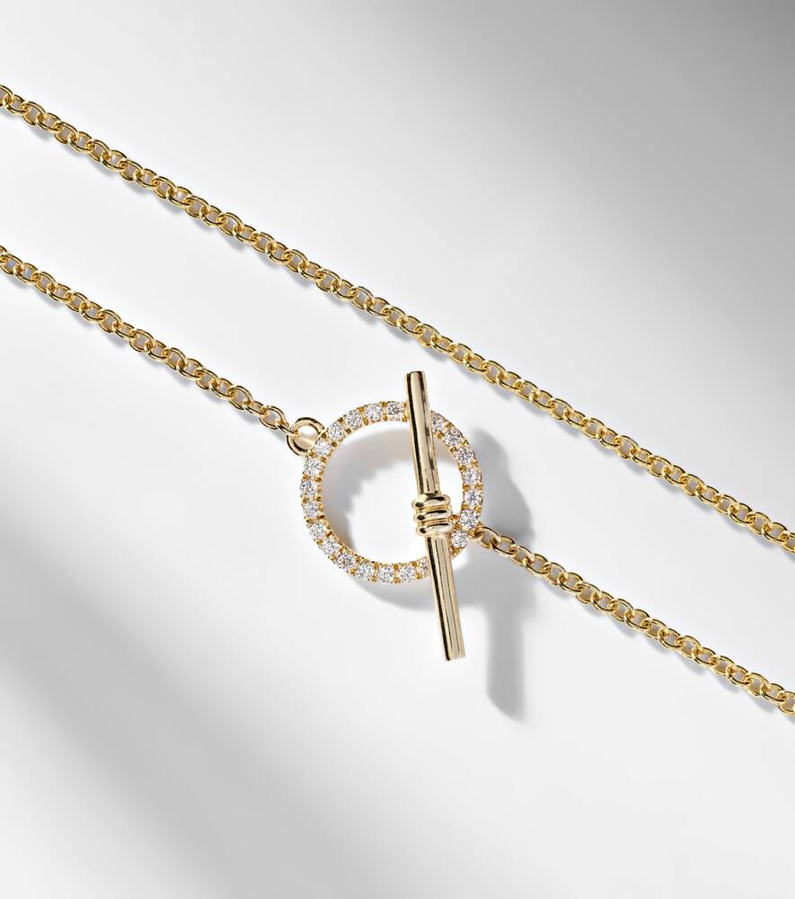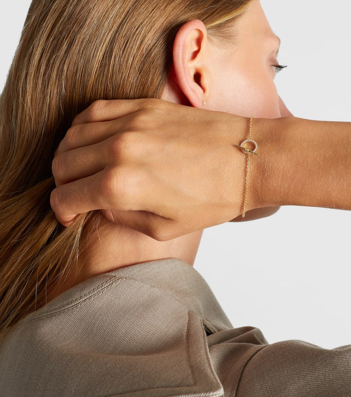 This 10kt gold bracelet with diamonds by Stone and Strand is a modern and minimalist new arrival. Made in the USA from 10kt yellow gold, this bracelet features a sleek chain adorned with 0.12 carats of shimmering diamonds. The design is a beautiful blend of a timeless aesthetic and modern luxury, perfect for adding a touch of refined sparkle to your daily look. It can be worn on its own for a subtle statement or stacked with other pieces for a bolder, more personalized style.