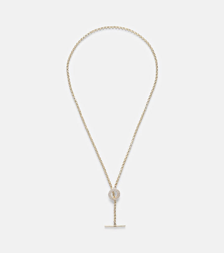 This necklace is made in the USA from 14kt yellow gold with 0.392 carats of diamonds and a toggle clasp. It has an open length of 41 cm (16"), a min width of 2 mm (0.1"), and a max width of 18 mm (0.7").