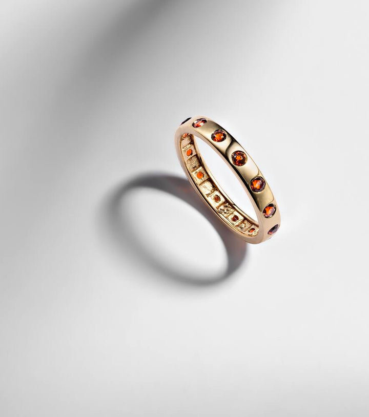 This ring is made in the USA from 10kt yellow gold with 0.24 carats of garnet. It has a width of 3 mm (0.1").
