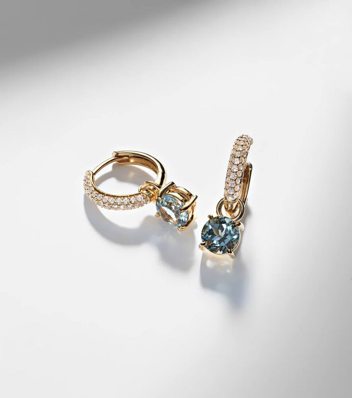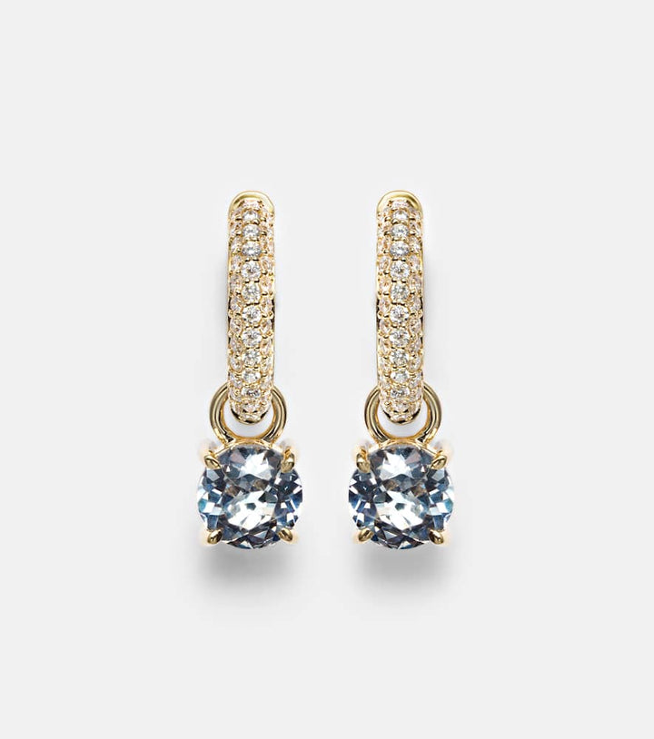 These huggie earrings are made in India from 14kt yellow gold with 1.92 carats of spinel and 1.92 carats of diamonds with a SI clarity grade. They have a width of 3 mm (0.1"), an inner diameter of 10 mm (0.4"), a pendant length of 9 mm (0.35"), and a pendant width of 6 mm (0.25").
