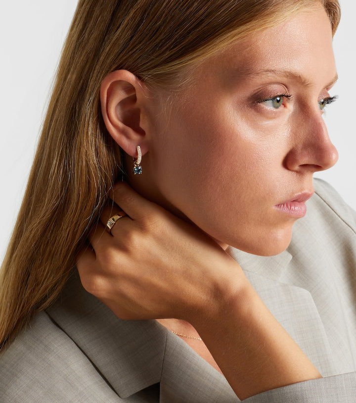 These 14kt gold huggie earrings with spinel and diamonds by Stone and Strand are a magnificent and opulent statement. Made in India from 14kt yellow gold, these earrings are a breathtaking masterpiece, combining the beautiful luster of gold with the brilliant sparkle of diamonds and spinel. The design is a celebration of a sophisticated and graceful style and is perfect for adding a touch of high-end sparkle to your look.