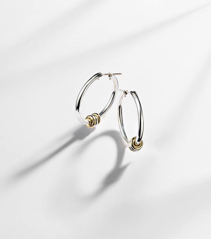 These earrings are made in the USA from sterling silver and 18kt yellow gold. They have a min width of 2 mm (0.1"), a max width of 5 mm (0.2"), and an inner diameter of 21 mm (0.85").