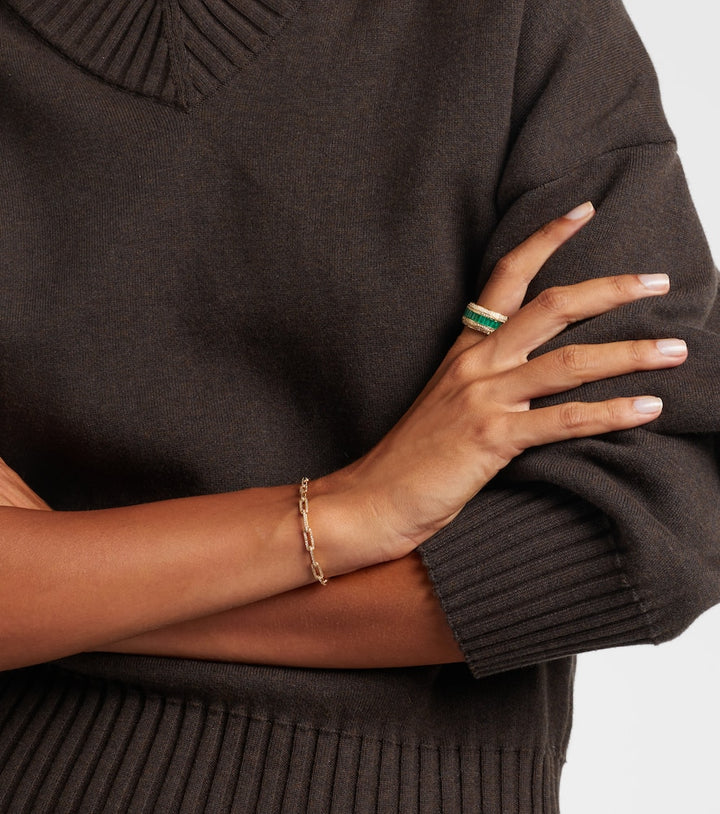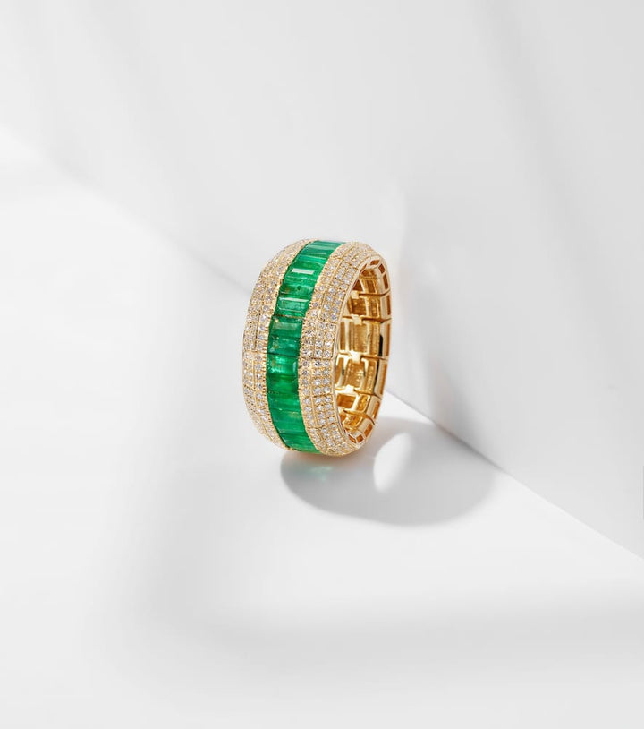 This ring is made in the USA from 18kt yellow gold. It features baguette-cut emeralds and diamonds with a total carat weight of 0.67. It has a max width of 10mm (0.4').