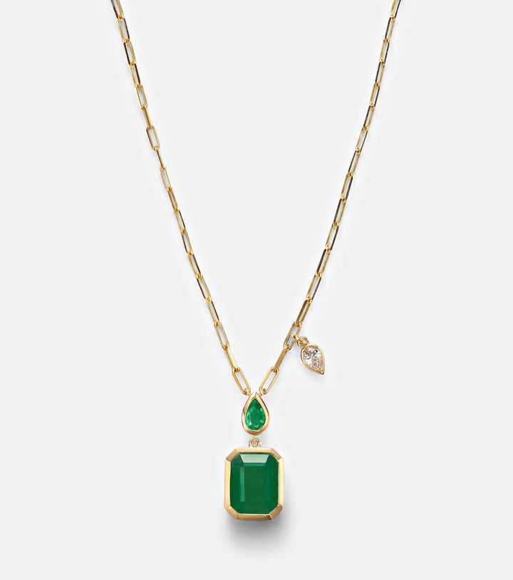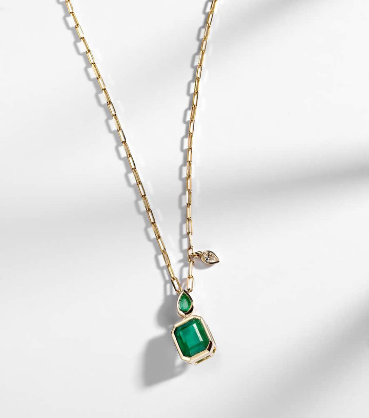 This adjustable necklace is made in the USA from 18kt yellow gold with a lobster-clasp fastening. It features 2.55 carats of emeralds and one diamond with VS clarity and F-G color. It has a length of 35-41cm (14-16") with a width of 1.5mm (0.05"). The pendant has a length of 18mm (0.7") and a width of 8mm (0.3").
