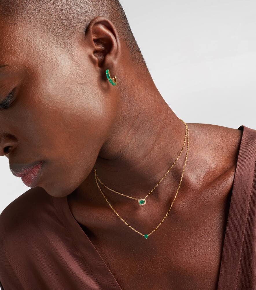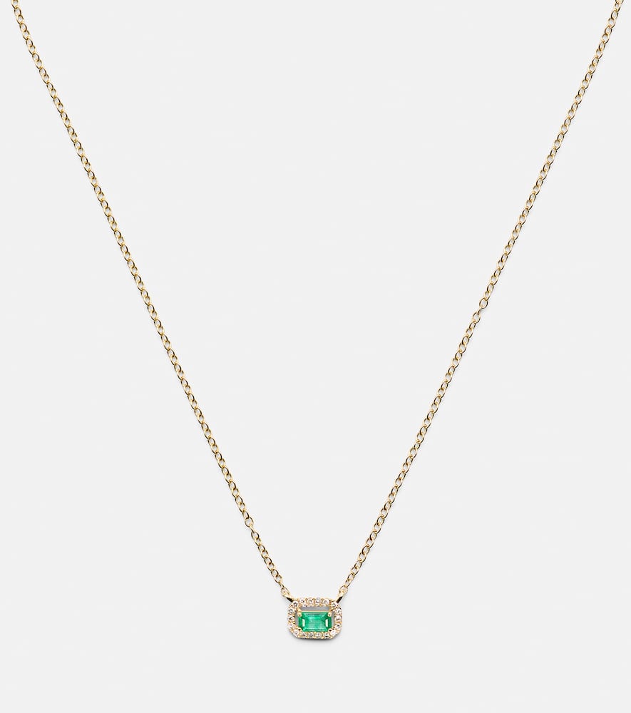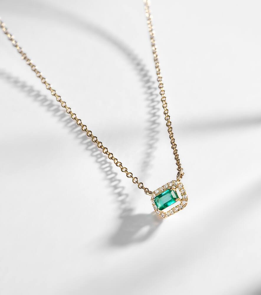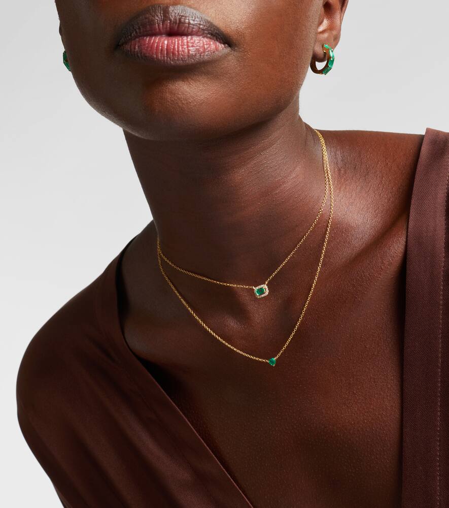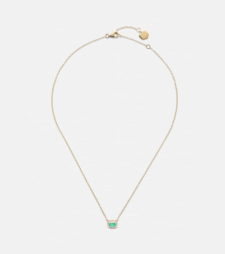 This adjustable necklace is made in the USA from 18kt yellow gold. It features emeralds and diamonds with a total carat weight of 0.57. It has a length of 34.5-39.5cm (13.5-15.5") with a width of 1mm (0.05"). The pendant has a length of 7mm (0.3") and a width of 8mm (0.3").