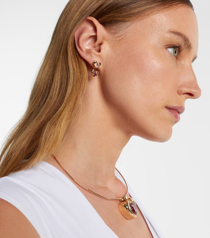 These 14kt gold earrings with tourmaline and rose quartz by Roxanne First are a fun and whimsical piece. Made in Thailand from 14kt yellow gold, these earrings feature a stunning array of heart-shaped tourmaline and rose quartz with a total carat weight of 3.12. The design is a celebration of a playful and modern aesthetic and is perfect for adding a touch of sophisticated charm to your look.