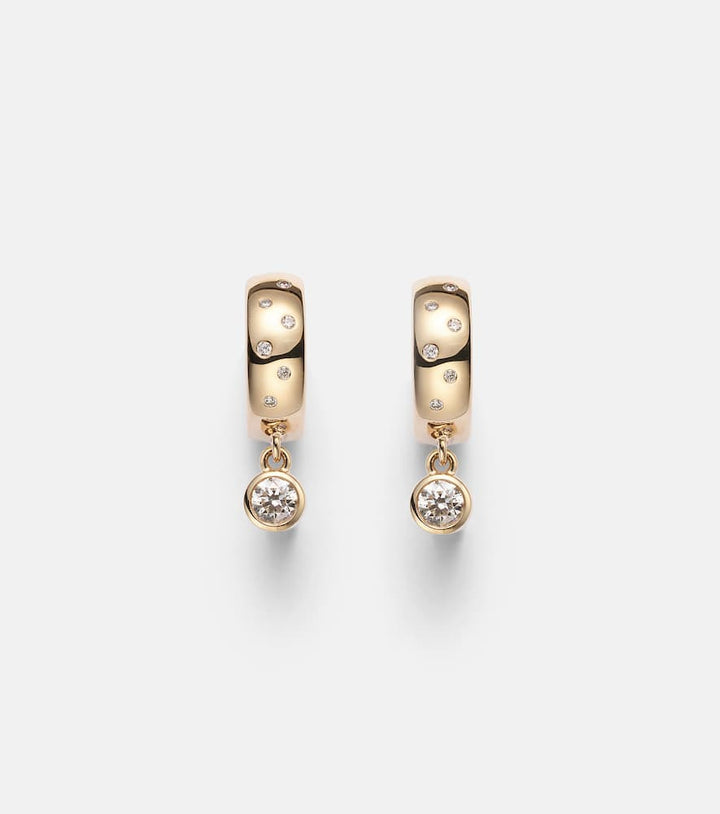 These earrings are made in the USA from 14kt yellow gold with 0.47 carats of diamonds. They have a width of 5mm (0.2"), an inner diameter of 10mm (0.4"), a pendant length of 7mm (0.3"), and a pendant width of 4mm (0.15").